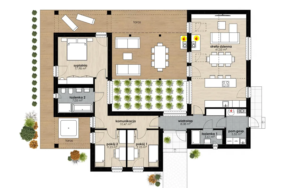 ten dom udowadnia, że dom modułowy może być luksusowy i niebanalny – nawet gdy przekryty jest tradycyjnym skośnym dachem – i może dać właścicielom poczucie ciągłego przebywania na wakacjach! dom posiada duże atrium, w stronę którego zwrócone są wnętrza i które ułatwia przenikanie ogrodu do wnętrz domu; ten parterowy dom zapewnia domownikom zarówno prywatność jak i wspólne przestrzenie; można do niego dostawić dodatkowo garaż i altanę, wszystko w systemie drewnianych modułów WoodCoreHouse