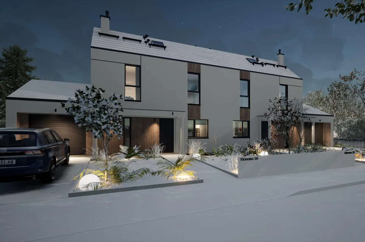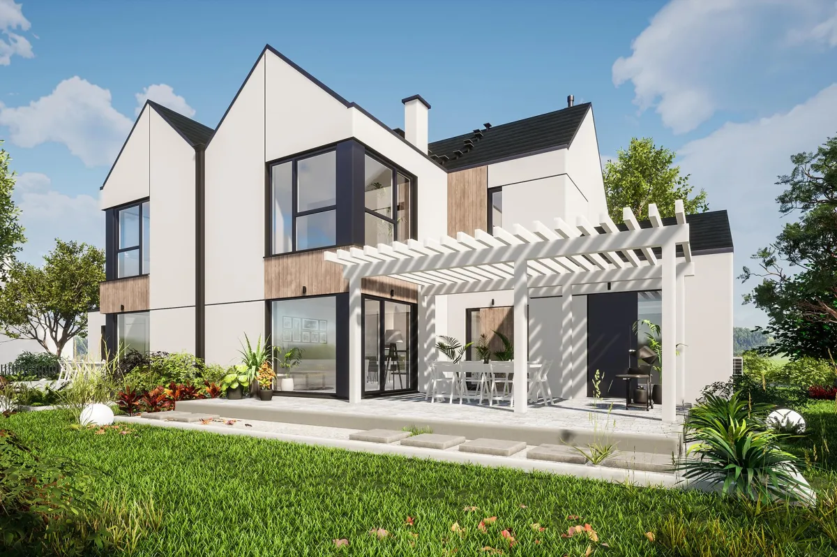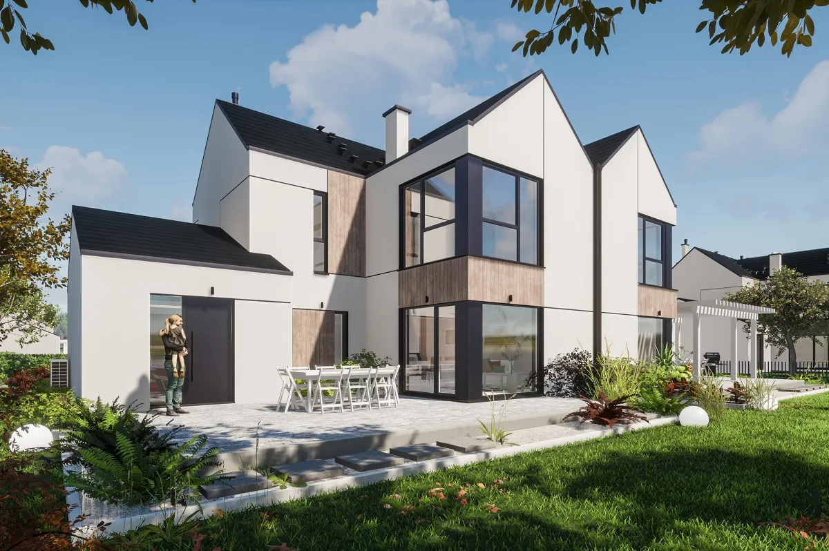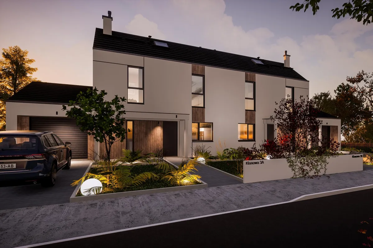 to projekt domu w konstrukcji szkieletowej drewnianej w zabudowie bliźniaczej, gdzie każdą z części zaprojektowano na rzucie litery L; z frontu widać prostą, liniową elewację, a od ogrodu ciekawą kombinację brył, kształtujących przyjemną przestrzeń wypoczynkową z tarasem i altaną w ogrodzie; z frontu wejście, garaż i proste okna, od ogrodu pięknie przeszklone narożniki części dziennej i głównej sypialni na obu kondygnacjach; wszystkie elementy zabudowy: dom, garaż i altana są zbudowane w systemie drewnianych modułów opracowanych przez WoodCoreHouse