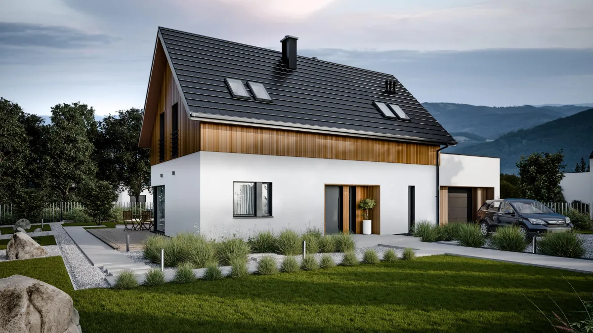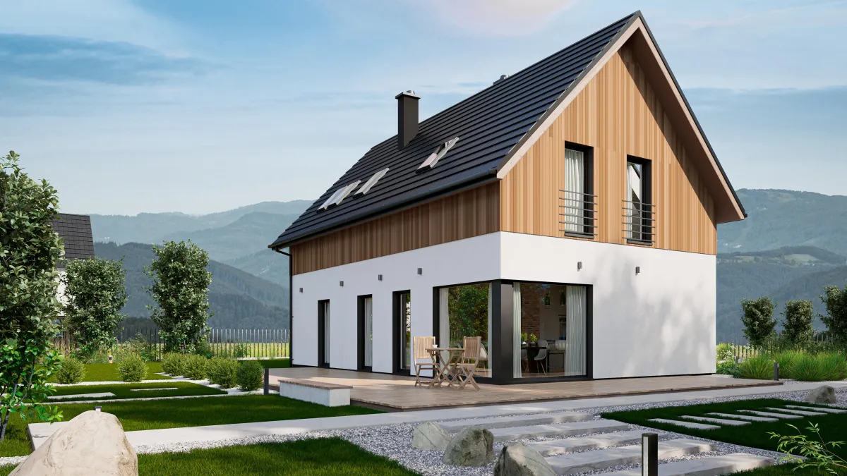 druga odsłona Świerka Syberyjskiego – domu w typie „nowoczesnej stodoły” lecz tym razem z tradycyjnym dachem dwuspadowym; prostota formy, zwarta, ekonomiczna bryła i duże możliwości aranżacji przestrzeni we wnętrzu to niewątpliwe zalety tego projektu;można do niego dodatkowo dostawić garaż (jedno lub dwu stanowiskowy) i gotową altanę wszystko w systemie drewnianych modułów opracowanych przez WoodCoreHouse