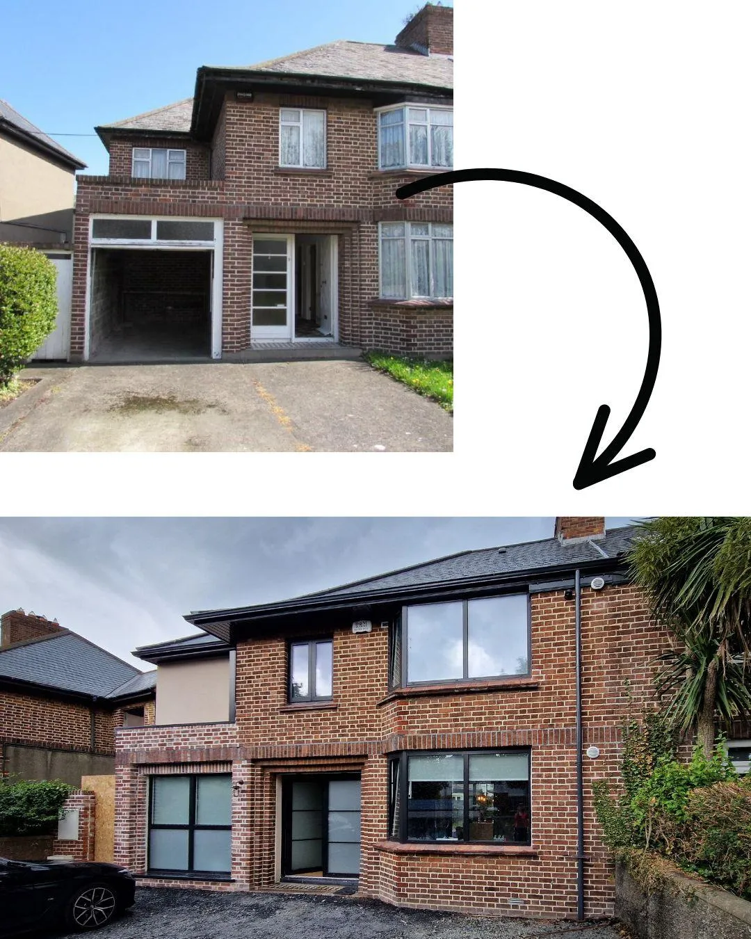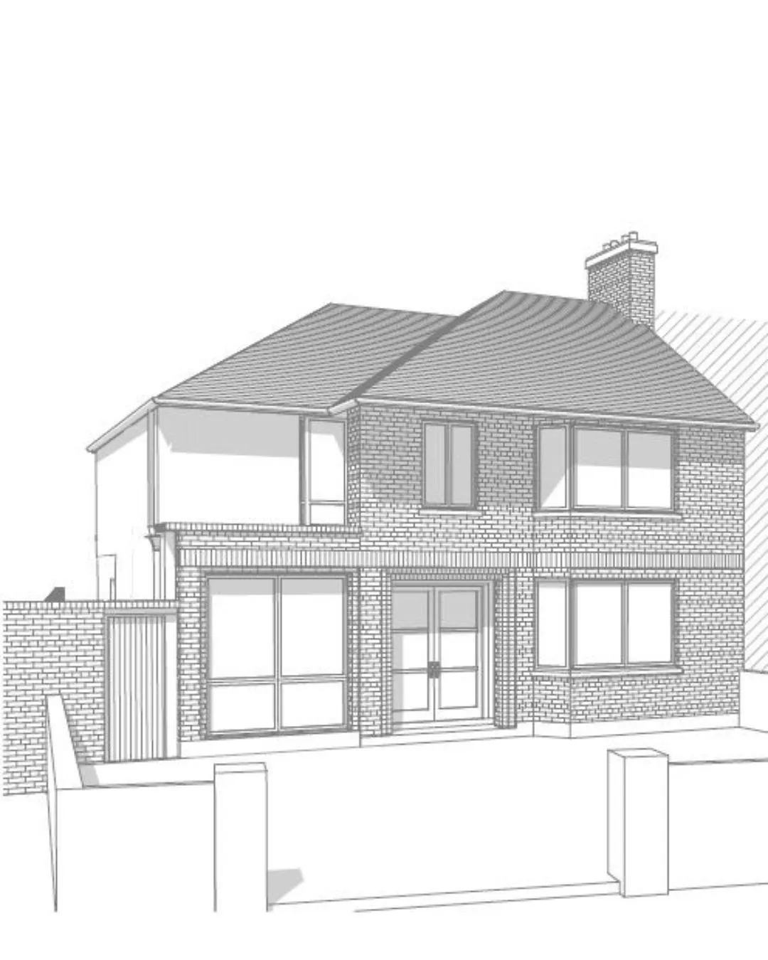 Celem tego projektu było lepsze wykorzystanie istniejącej bryły budynku i dostosowanie jej do potrzeb nowych mieszkańców. Dotychczasowy garaż od frontu został przekształcony w funkcjonalną przestrzeń mieszkalną z dużym oknem w miejscu bramy, co otworzyło wnętrze na światło i ogród frontowy.