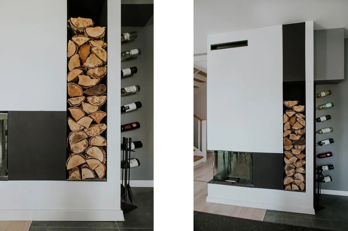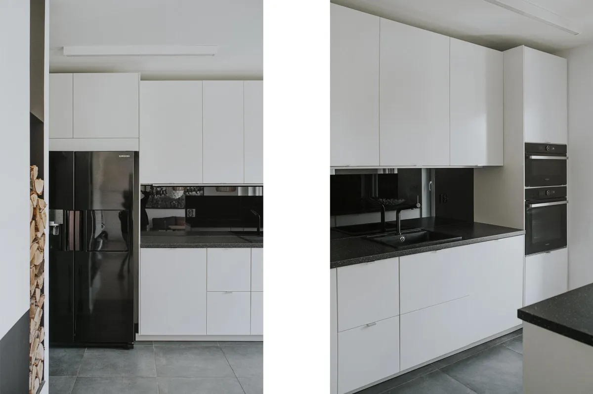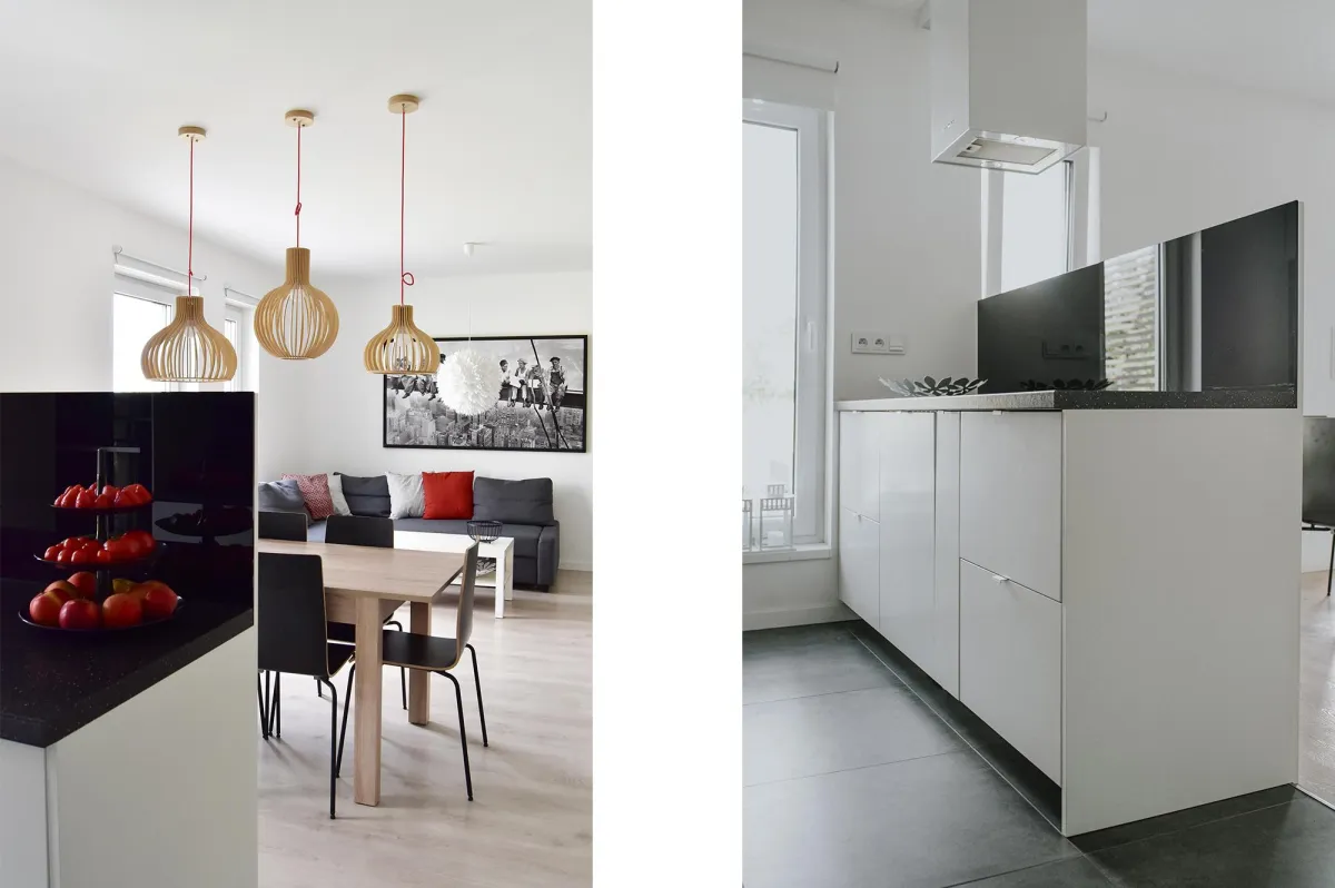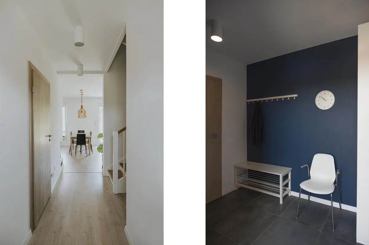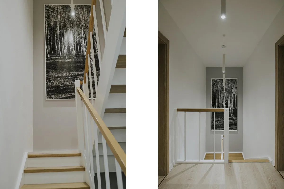 Projekt wszystkich wnętrz jest kontynuacją koncepcji całego domu; głównym założeniem było stworzenie prostej, eleganckiej przestrzeni, która nie kosztowałaby fortuny; spora ilość elementów wyposażenia to produkty gotowe, które można dostać w bardzo popularnych sklepach meblarskich; niemniej jednak niektóre z przedmiotów były wykonywane na zamówienie, a wszystkie zastosowane tu elementy zostały zaprojektowane tak, by się nawzajem uzupełniać i stworzyć stylową i spójną przestrzeń; główne zastosowane tu wykończenia to: drewno, beton, czarne detale, biele i szarości jako baza; w sypialni głównej dodano elementy z miedzi, w przestrzeni dziennej – nieco soczystej czerwieni, w holu wejściowym – ciemny granat, a w pokoju dziecięcym zdecydowane kolory zaznaczają osobistą przestrzeń każdego z dzieci; dodanie kilku zdjęć, paru grafik i dobrego oświetlenia uzupełniło klimat przytulnego i wygodnego domu