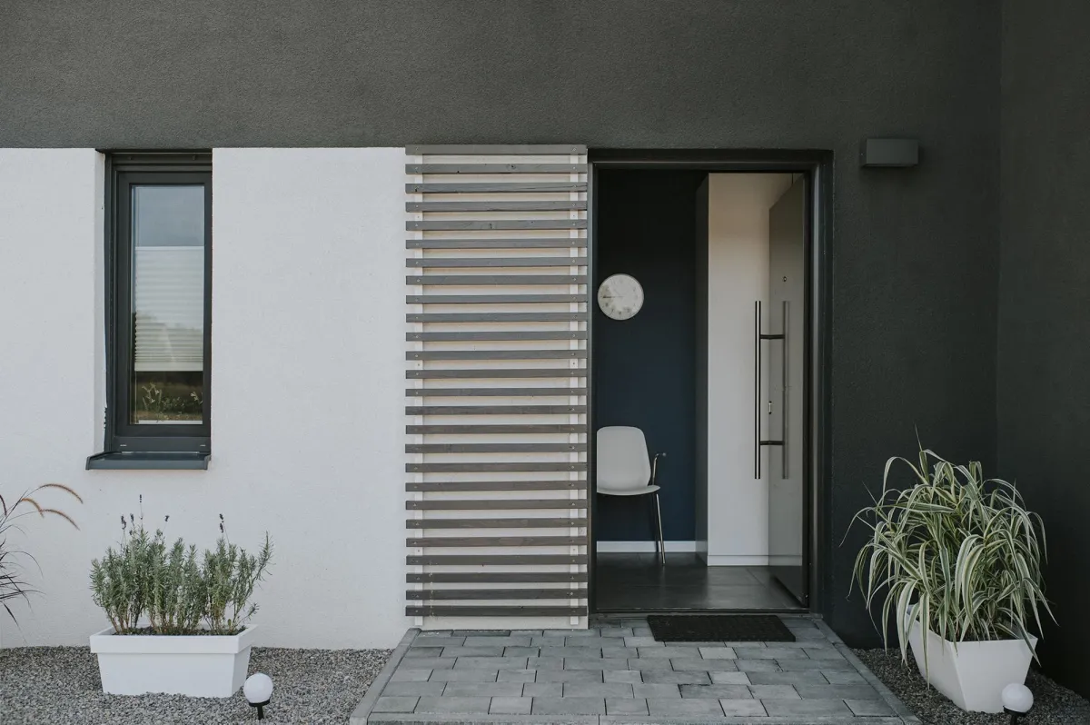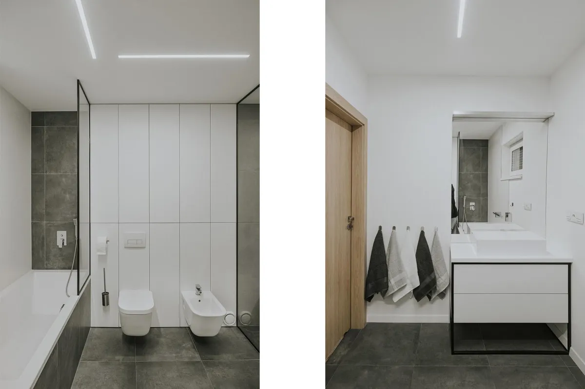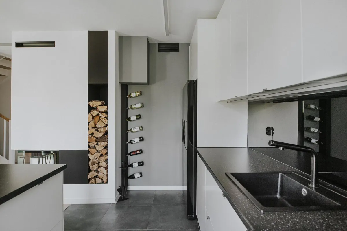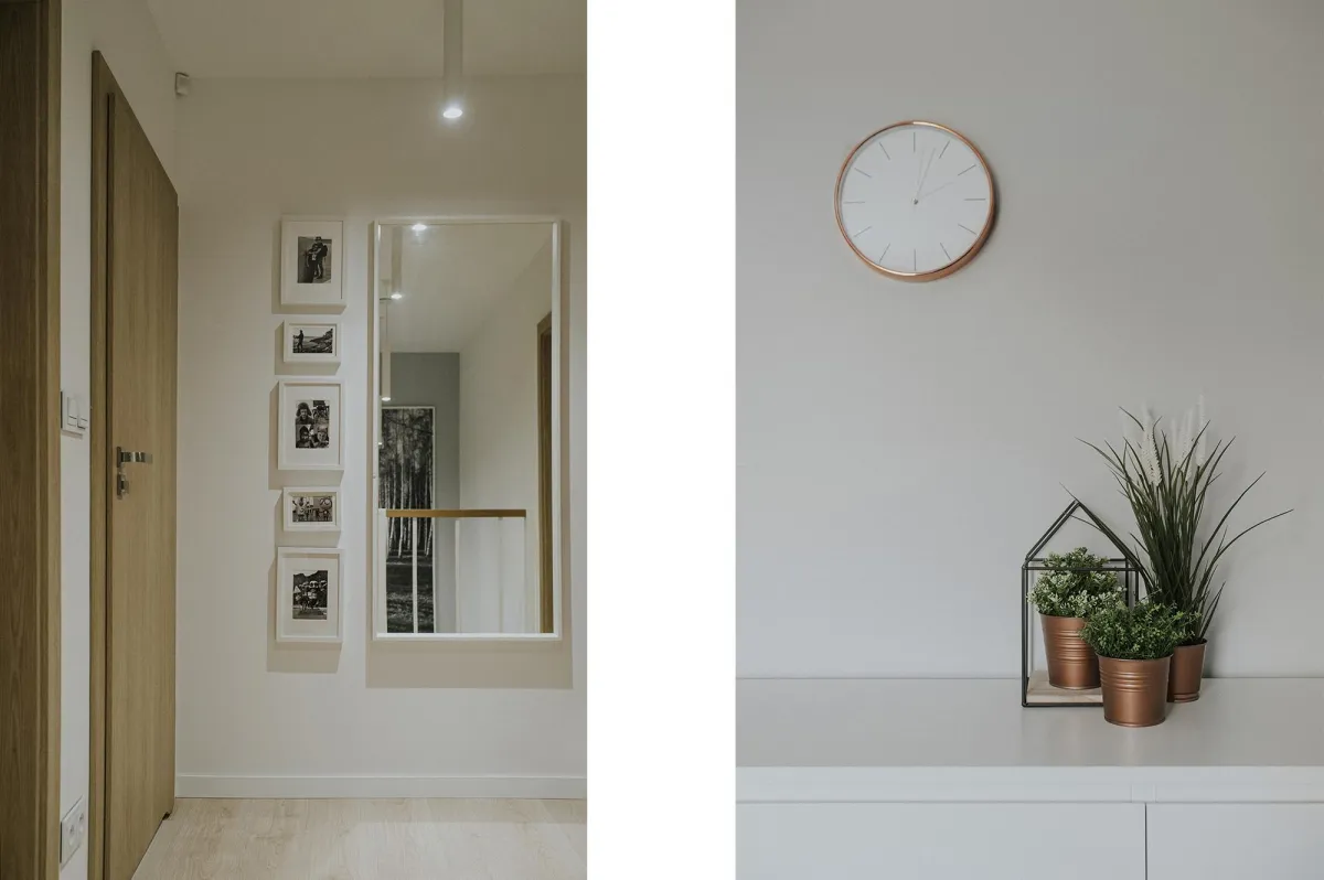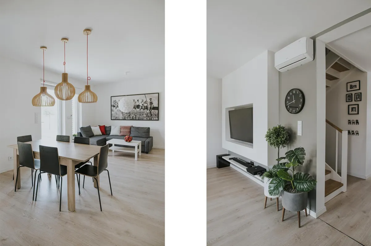 Projekt wszystkich wnętrz jest kontynuacją koncepcji całego domu; głównym założeniem było stworzenie prostej, eleganckiej przestrzeni, która nie kosztowałaby fortuny; spora ilość elementów wyposażenia to produkty gotowe, które można dostać w bardzo popularnych sklepach meblarskich; niemniej jednak niektóre z przedmiotów były wykonywane na zamówienie, a wszystkie zastosowane tu elementy zostały zaprojektowane tak, by się nawzajem uzupełniać i stworzyć stylową i spójną przestrzeń; główne zastosowane tu wykończenia to: drewno, beton, czarne detale, biele i szarości jako baza; w sypialni głównej dodano elementy z miedzi, w przestrzeni dziennej – nieco soczystej czerwieni, w holu wejściowym – ciemny granat, a w pokoju dziecięcym zdecydowane kolory zaznaczają osobistą przestrzeń każdego z dzieci; dodanie kilku zdjęć, paru grafik i dobrego oświetlenia uzupełniło klimat przytulnego i wygodnego domu