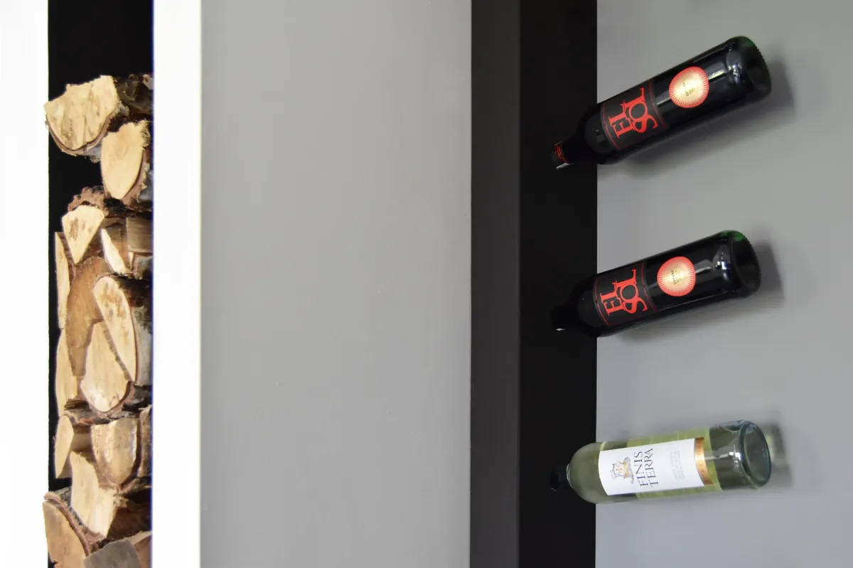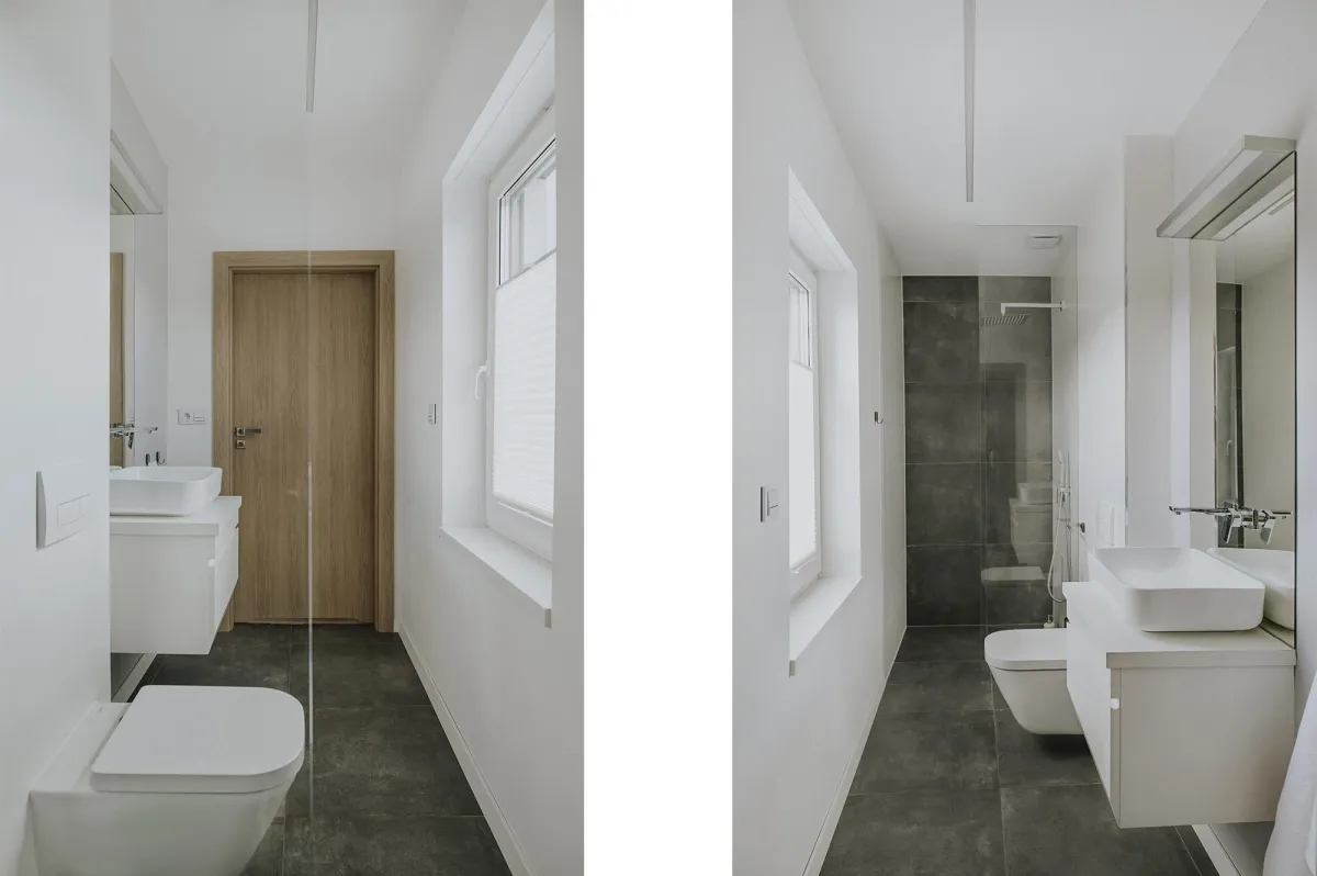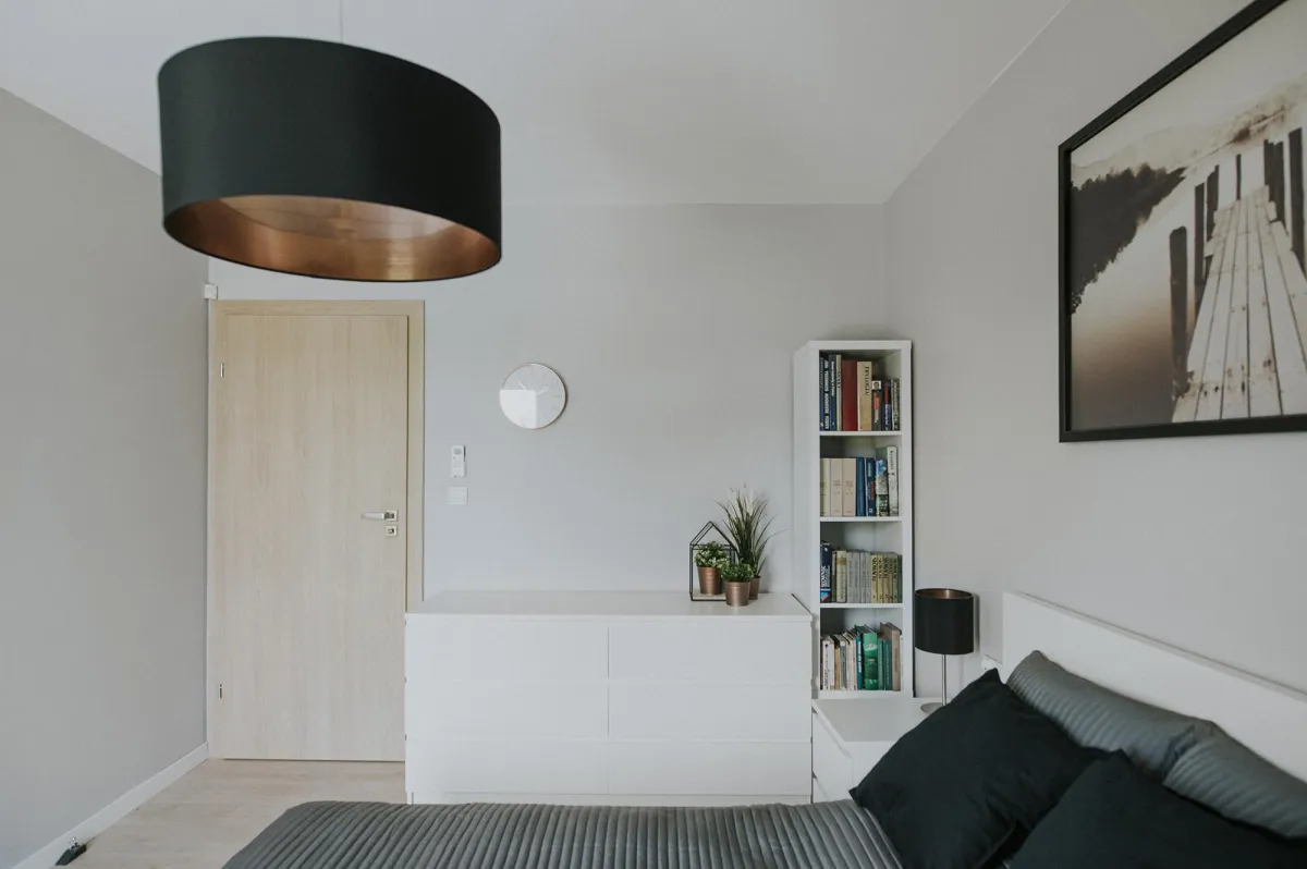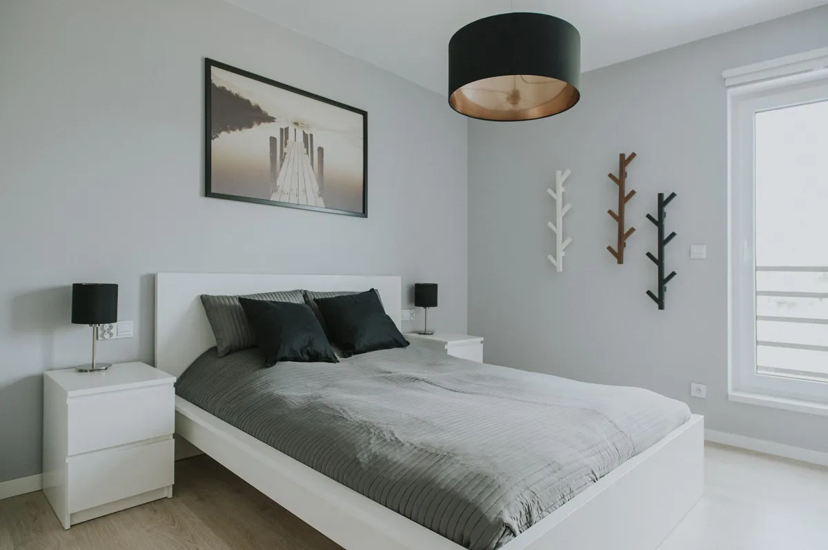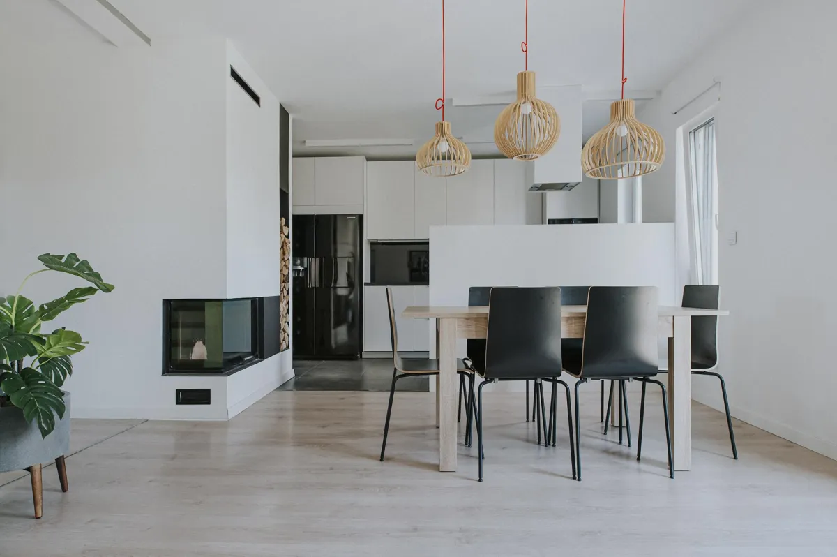 Projekt wszystkich wnętrz jest kontynuacją koncepcji całego domu; głównym założeniem było stworzenie prostej, eleganckiej przestrzeni, która nie kosztowałaby fortuny; spora ilość elementów wyposażenia to produkty gotowe, które można dostać w bardzo popularnych sklepach meblarskich; niemniej jednak niektóre z przedmiotów były wykonywane na zamówienie, a wszystkie zastosowane tu elementy zostały zaprojektowane tak, by się nawzajem uzupełniać i stworzyć stylową i spójną przestrzeń; główne zastosowane tu wykończenia to: drewno, beton, czarne detale, biele i szarości jako baza; w sypialni głównej dodano elementy z miedzi, w przestrzeni dziennej – nieco soczystej czerwieni, w holu wejściowym – ciemny granat, a w pokoju dziecięcym zdecydowane kolory zaznaczają osobistą przestrzeń każdego z dzieci; dodanie kilku zdjęć, paru grafik i dobrego oświetlenia uzupełniło klimat przytulnego i wygodnego domu