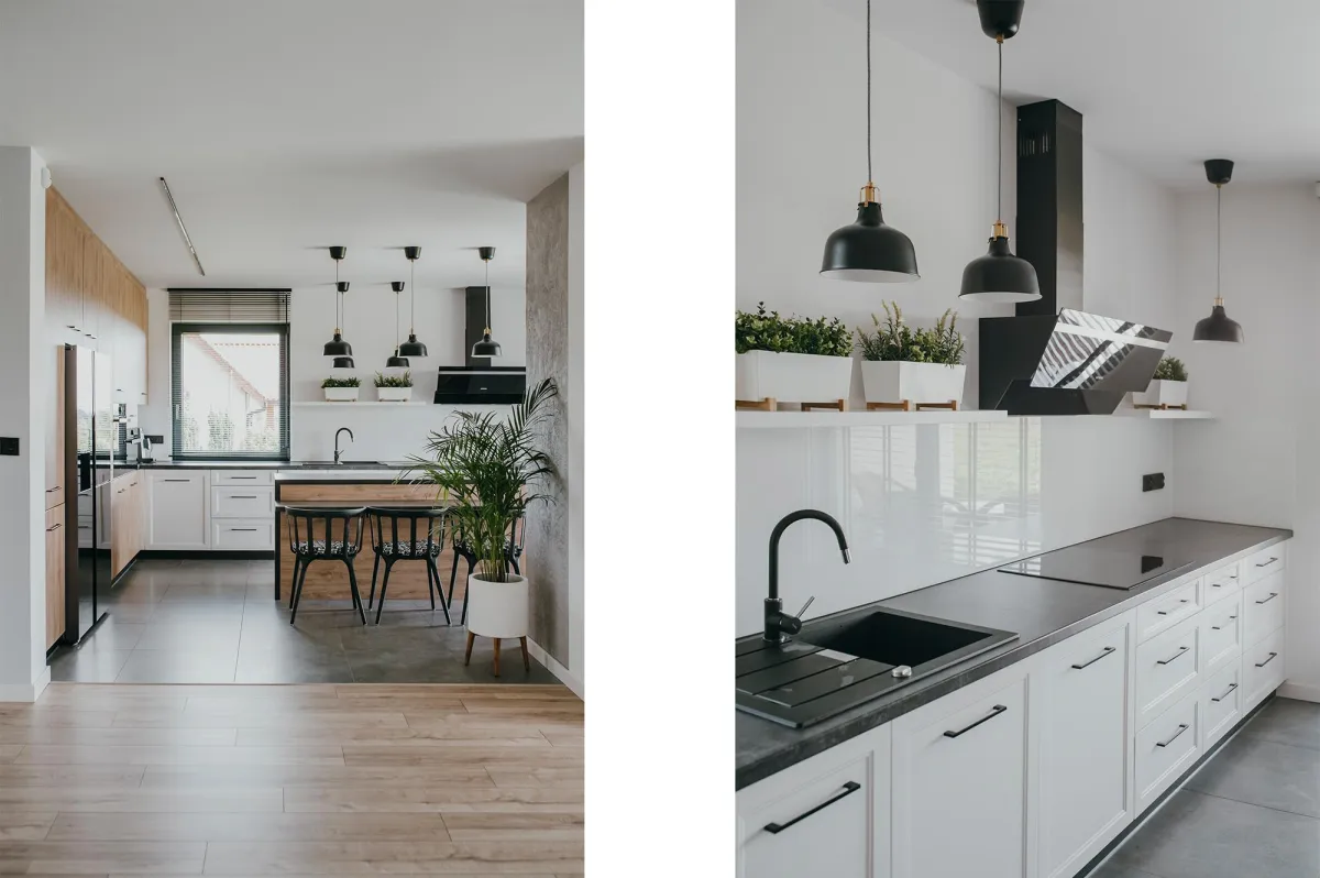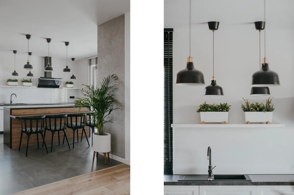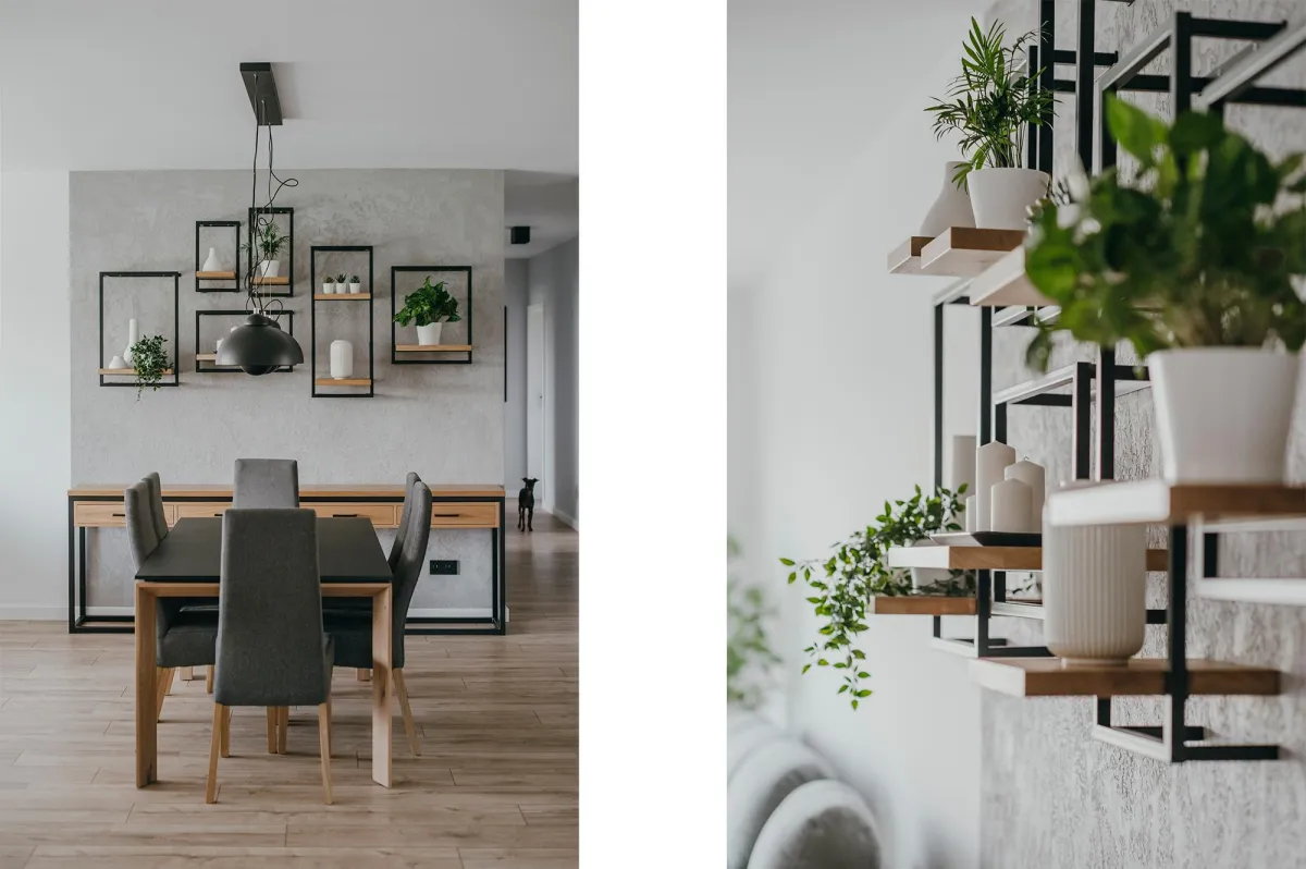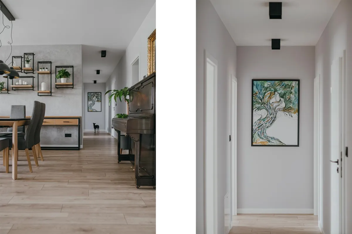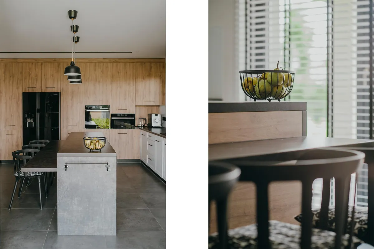 nowo wybudowany przestrzenny dom wymagał pełnego projektu wnętrz, utrzymanych we współczesnym klimacie, ale z odrobiną nostalgii; wszystkie pomieszczenia zostały zaprojektowane jako nowoczesne, ale w wybranych miejscach można zauważyć: stare pianino z lustrem w złoconej klasycznej ramie, którym towarzyszą nowe czarno-złote lampy, albo secesyjna akwarela zawieszona w minimalistycznym holu, czy stylowy zegar w modnym holu wejściowym, itd.; główne materiały wykończeniowe pozostają w harmonii: drewno, beton i szara cegła umieszczone na białym tle wraz z powtarzalnymi czarnymi detalami; często pojawiają się też motywy roślinne: na szklanych drzwiach do strefy dziennej, w drzewnym kształcie półki, na obiciach krzeseł, poduszkach i w formie roślin ustawionych w całym domu; 3 sypialnie otrzymały dodatkowe kolory: granatowy, odcienie zieleni i szarości; łazienki i hole utrzymano w czerni&bieli; prawie wszystkie meble zostały wykonane na zamówienie, co w połączeniu z powtarzalnymi wykończeniami przestrzeni stworzyło spójną i przytulną przestrzeń domową