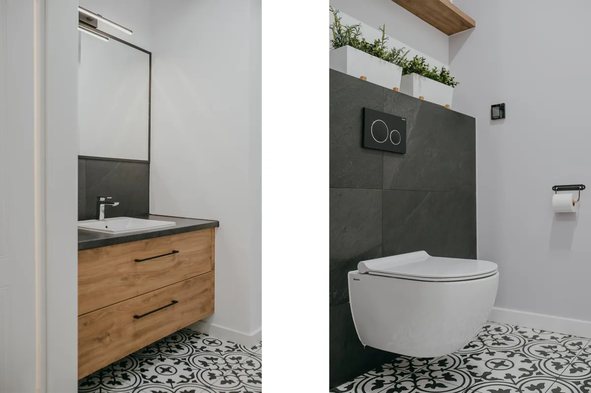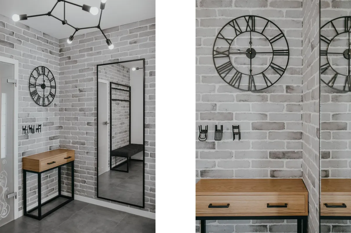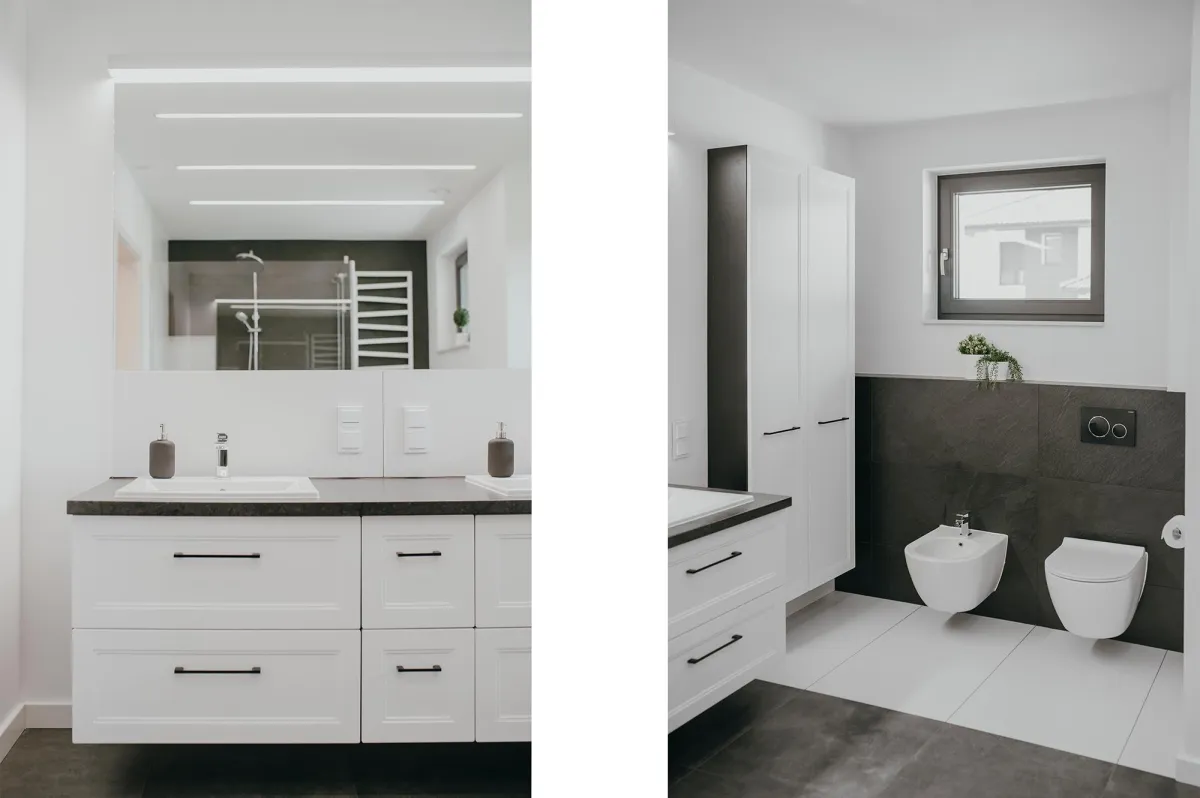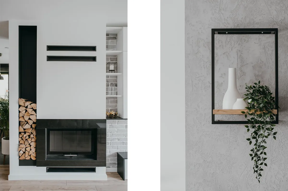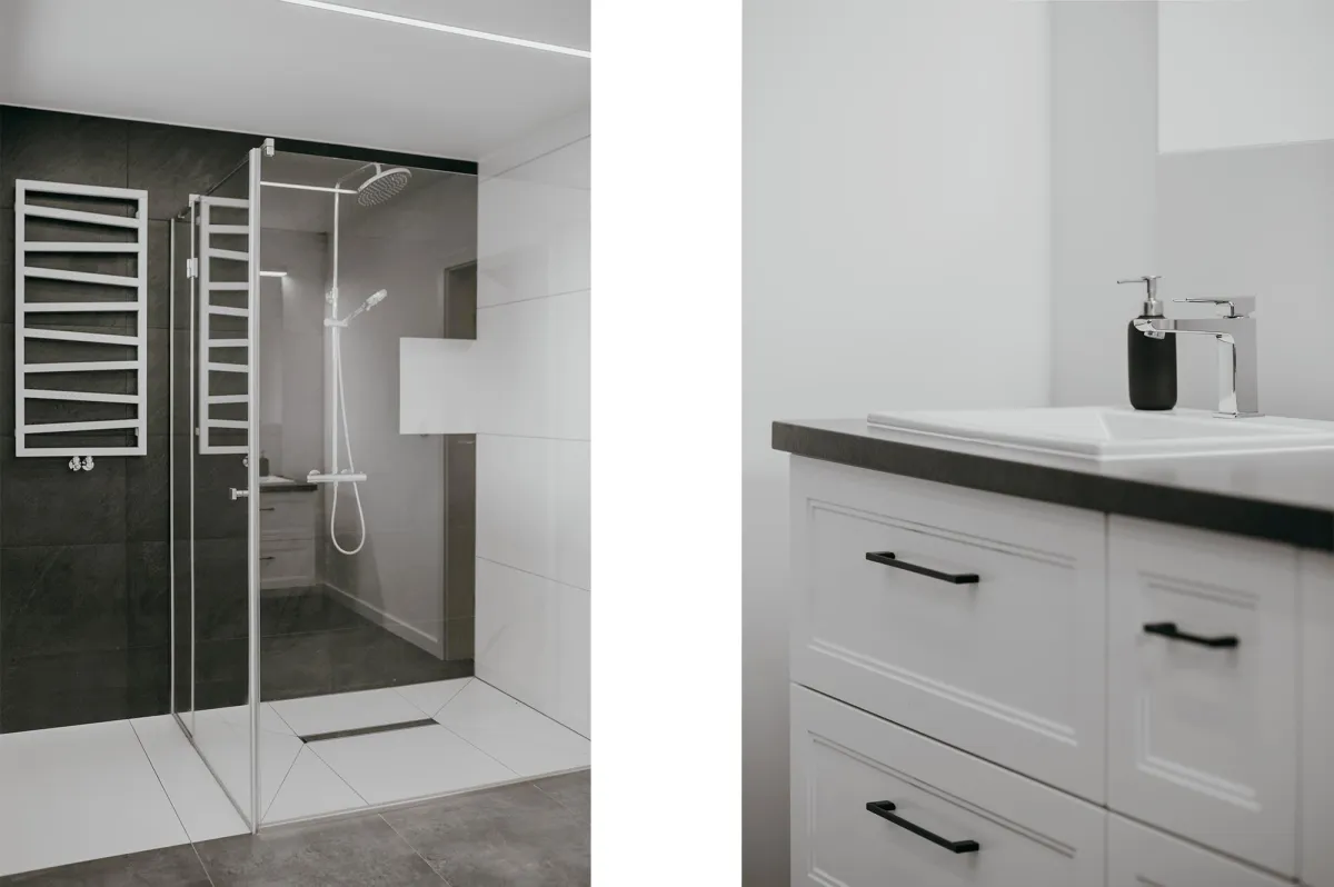 nowo wybudowany przestrzenny dom wymagał pełnego projektu wnętrz, utrzymanych we współczesnym klimacie, ale z odrobiną nostalgii; wszystkie pomieszczenia zostały zaprojektowane jako nowoczesne, ale w wybranych miejscach można zauważyć: stare pianino z lustrem w złoconej klasycznej ramie, którym towarzyszą nowe czarno-złote lampy, albo secesyjna akwarela zawieszona w minimalistycznym holu, czy stylowy zegar w modnym holu wejściowym, itd.; główne materiały wykończeniowe pozostają w harmonii: drewno, beton i szara cegła umieszczone na białym tle wraz z powtarzalnymi czarnymi detalami; często pojawiają się też motywy roślinne: na szklanych drzwiach do strefy dziennej, w drzewnym kształcie półki, na obiciach krzeseł, poduszkach i w formie roślin ustawionych w całym domu; 3 sypialnie otrzymały dodatkowe kolory: granatowy, odcienie zieleni i szarości; łazienki i hole utrzymano w czerni&bieli; prawie wszystkie meble zostały wykonane na zamówienie, co w połączeniu z powtarzalnymi wykończeniami przestrzeni stworzyło spójną i przytulną przestrzeń domową
