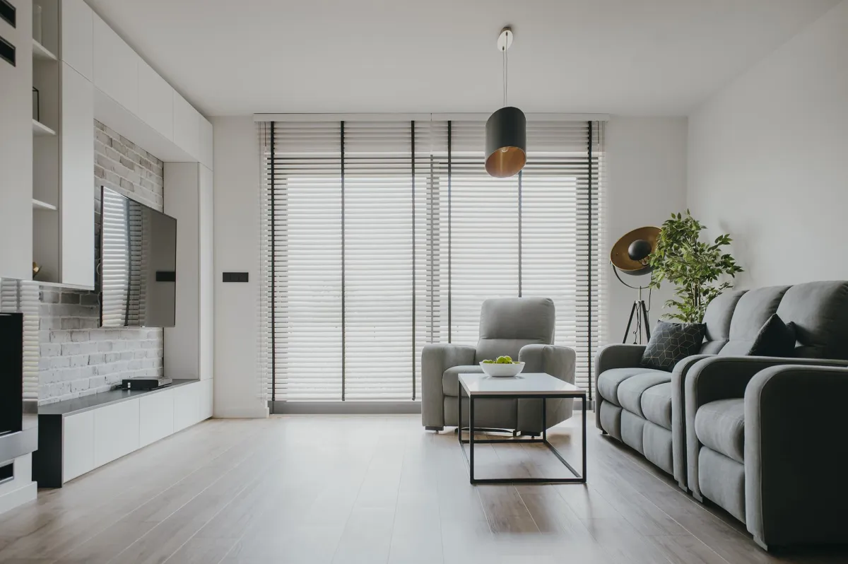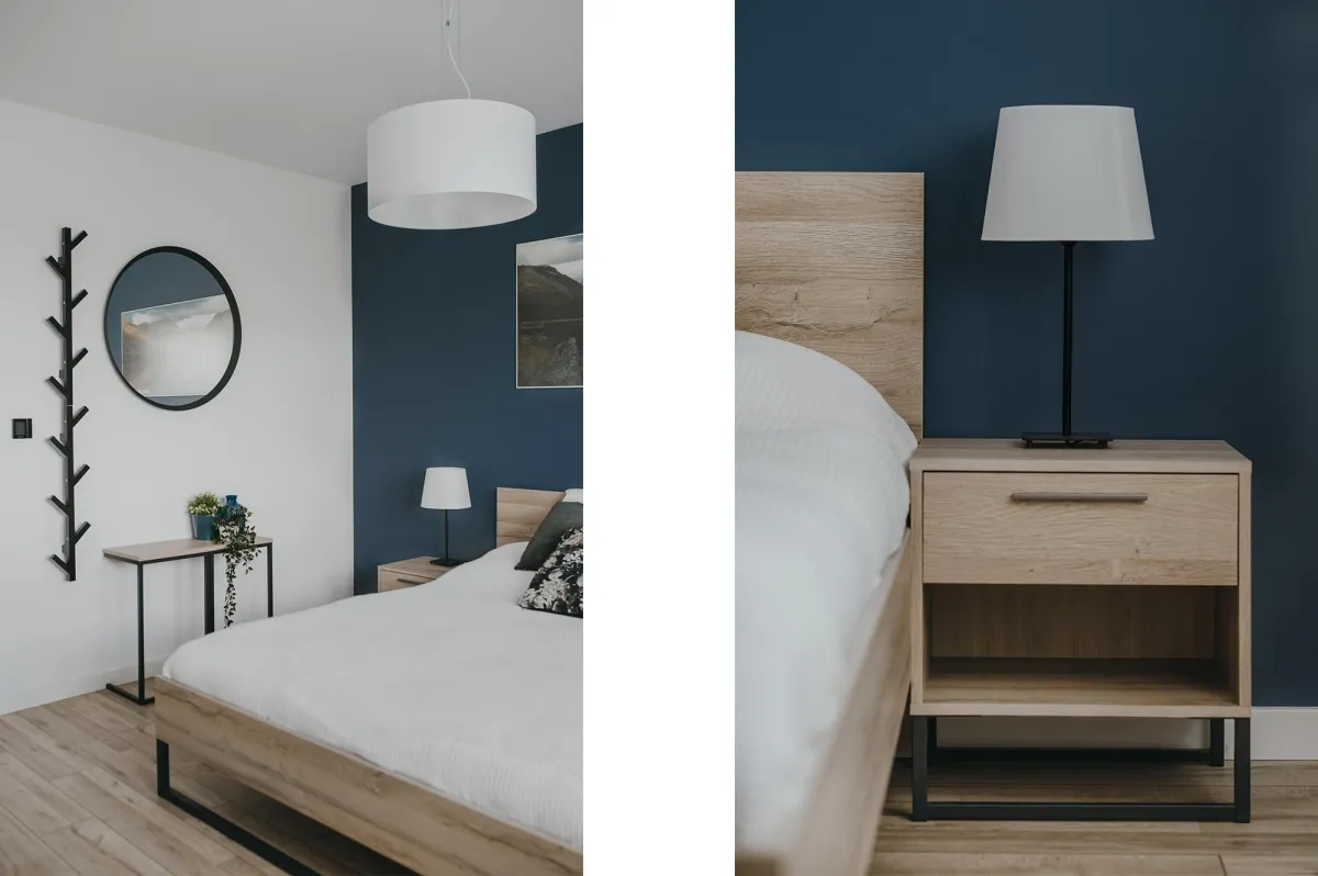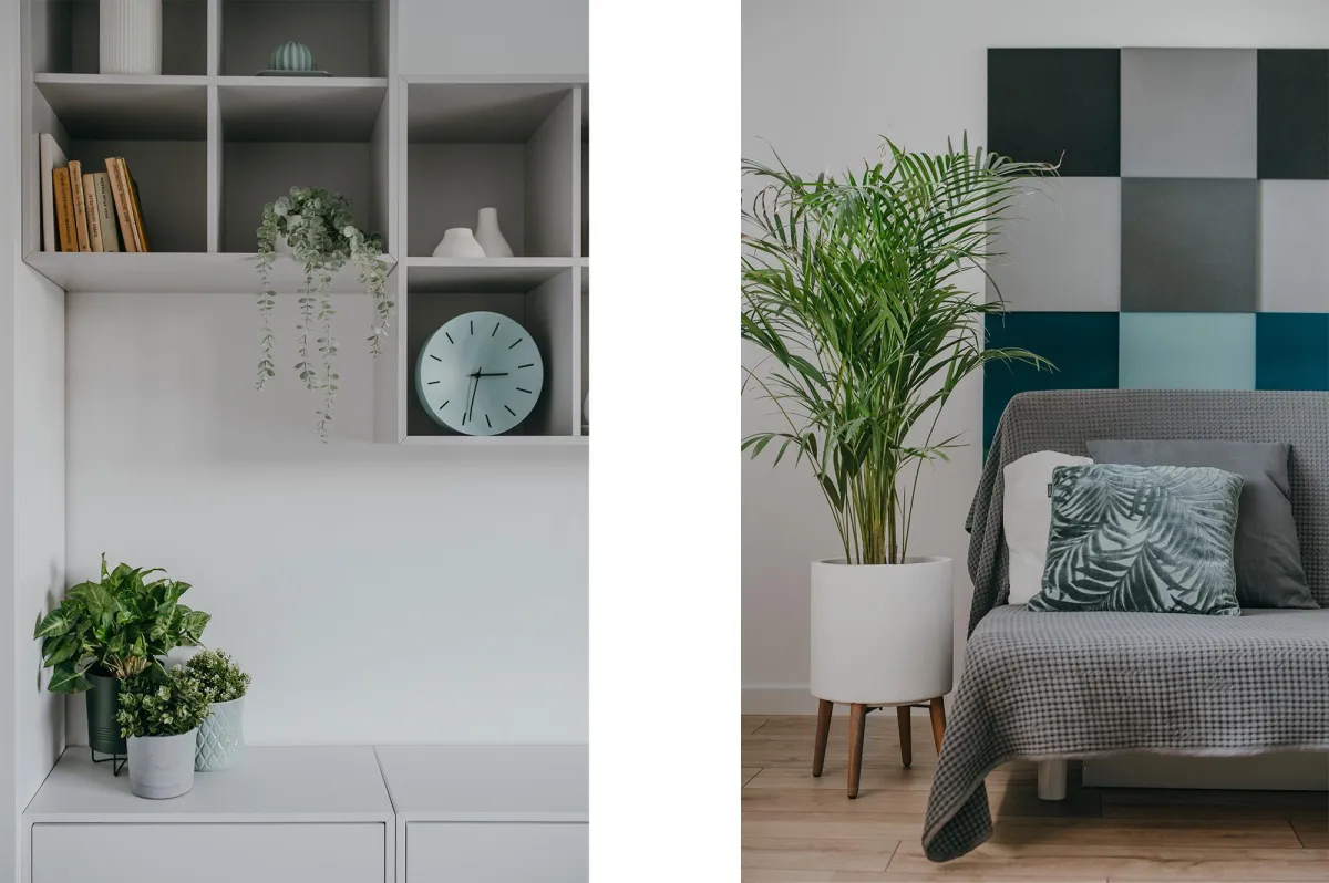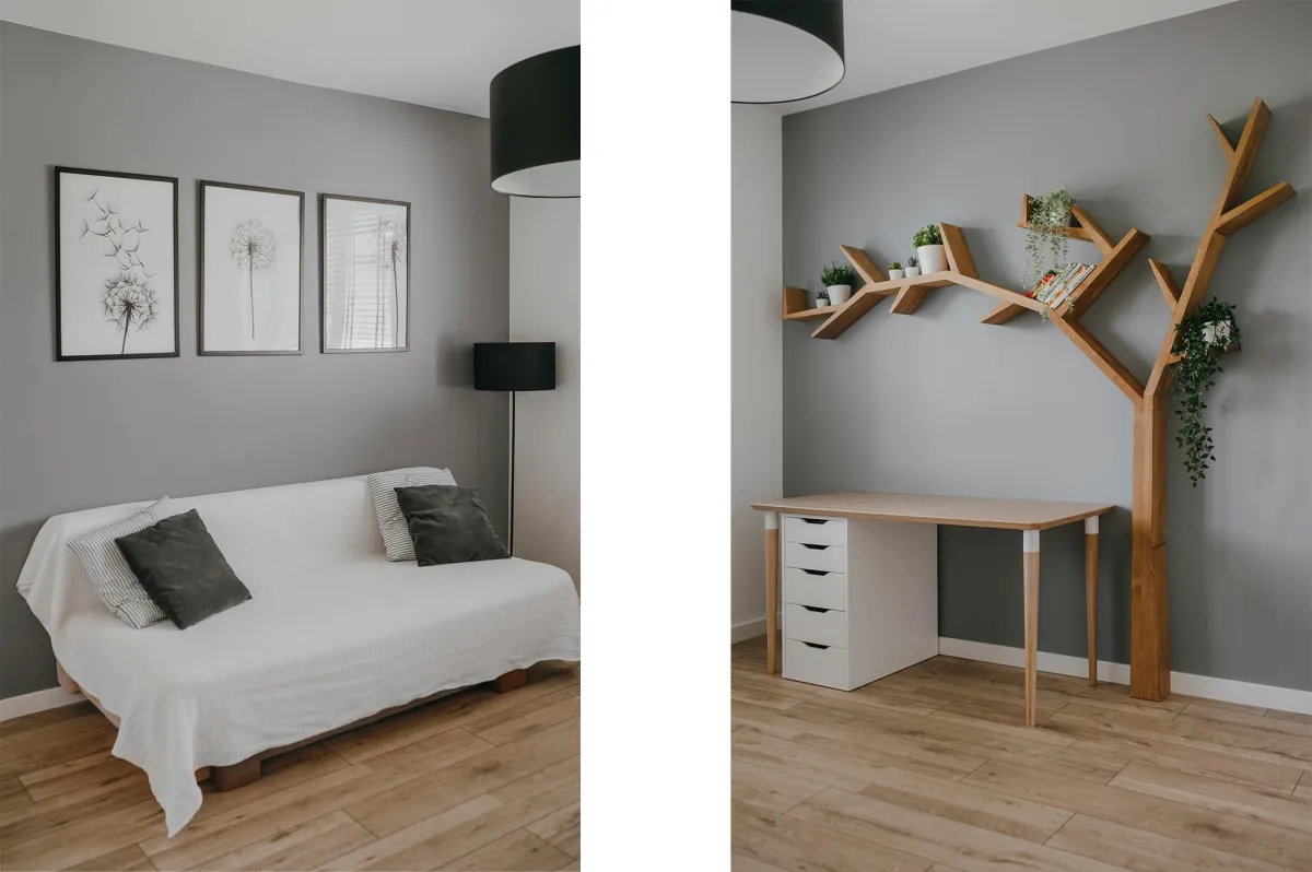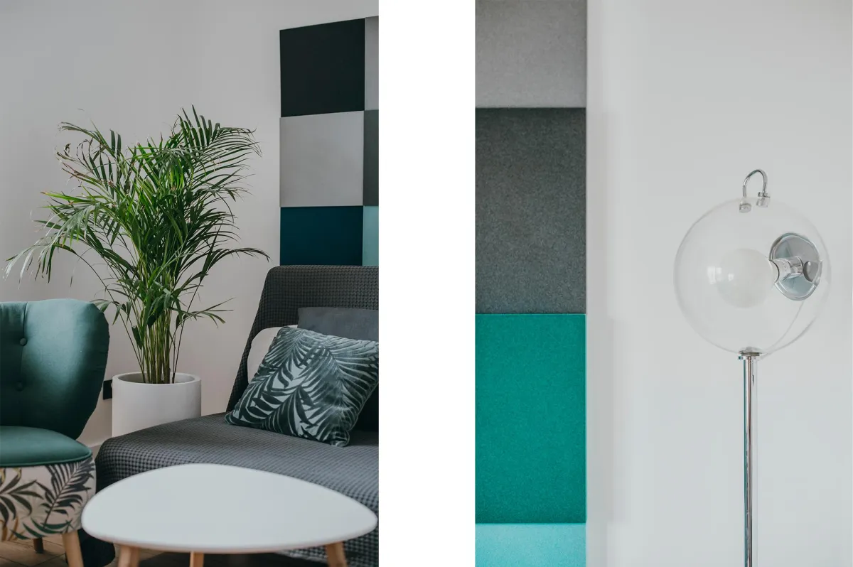 nowo wybudowany przestrzenny dom wymagał pełnego projektu wnętrz, utrzymanych we współczesnym klimacie, ale z odrobiną nostalgii; wszystkie pomieszczenia zostały zaprojektowane jako nowoczesne, ale w wybranych miejscach można zauważyć: stare pianino z lustrem w złoconej klasycznej ramie, którym towarzyszą nowe czarno-złote lampy, albo secesyjna akwarela zawieszona w minimalistycznym holu, czy stylowy zegar w modnym holu wejściowym, itd.; główne materiały wykończeniowe pozostają w harmonii: drewno, beton i szara cegła umieszczone na białym tle wraz z powtarzalnymi czarnymi detalami; często pojawiają się też motywy roślinne: na szklanych drzwiach do strefy dziennej, w drzewnym kształcie półki, na obiciach krzeseł, poduszkach i w formie roślin ustawionych w całym domu; 3 sypialnie otrzymały dodatkowe kolory: granatowy, odcienie zieleni i szarości; łazienki i hole utrzymano w czerni&bieli; prawie wszystkie meble zostały wykonane na zamówienie, co w połączeniu z powtarzalnymi wykończeniami przestrzeni stworzyło spójną i przytulną przestrzeń domową