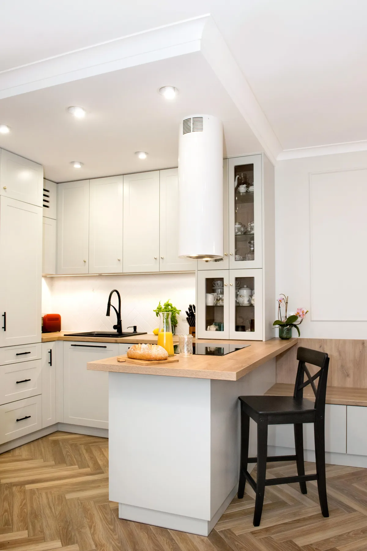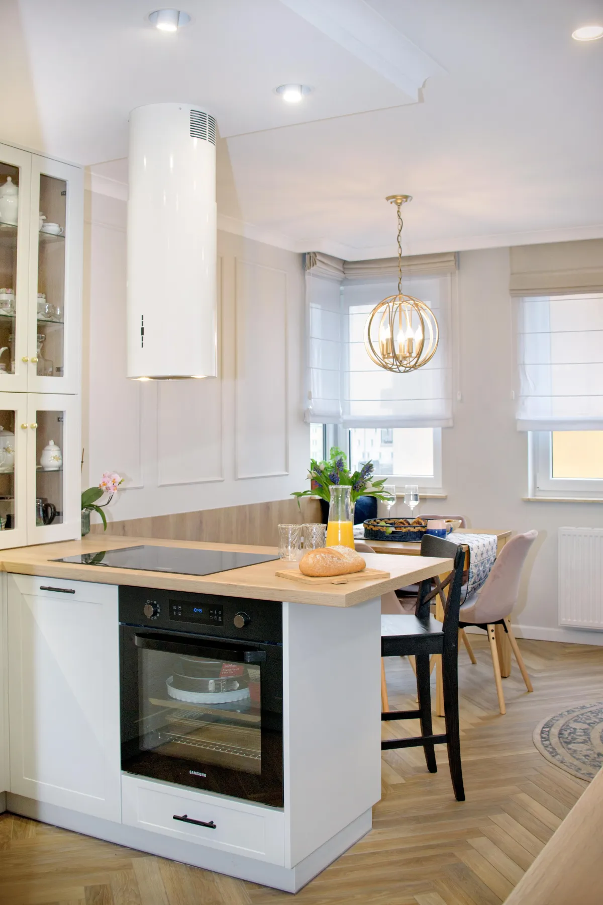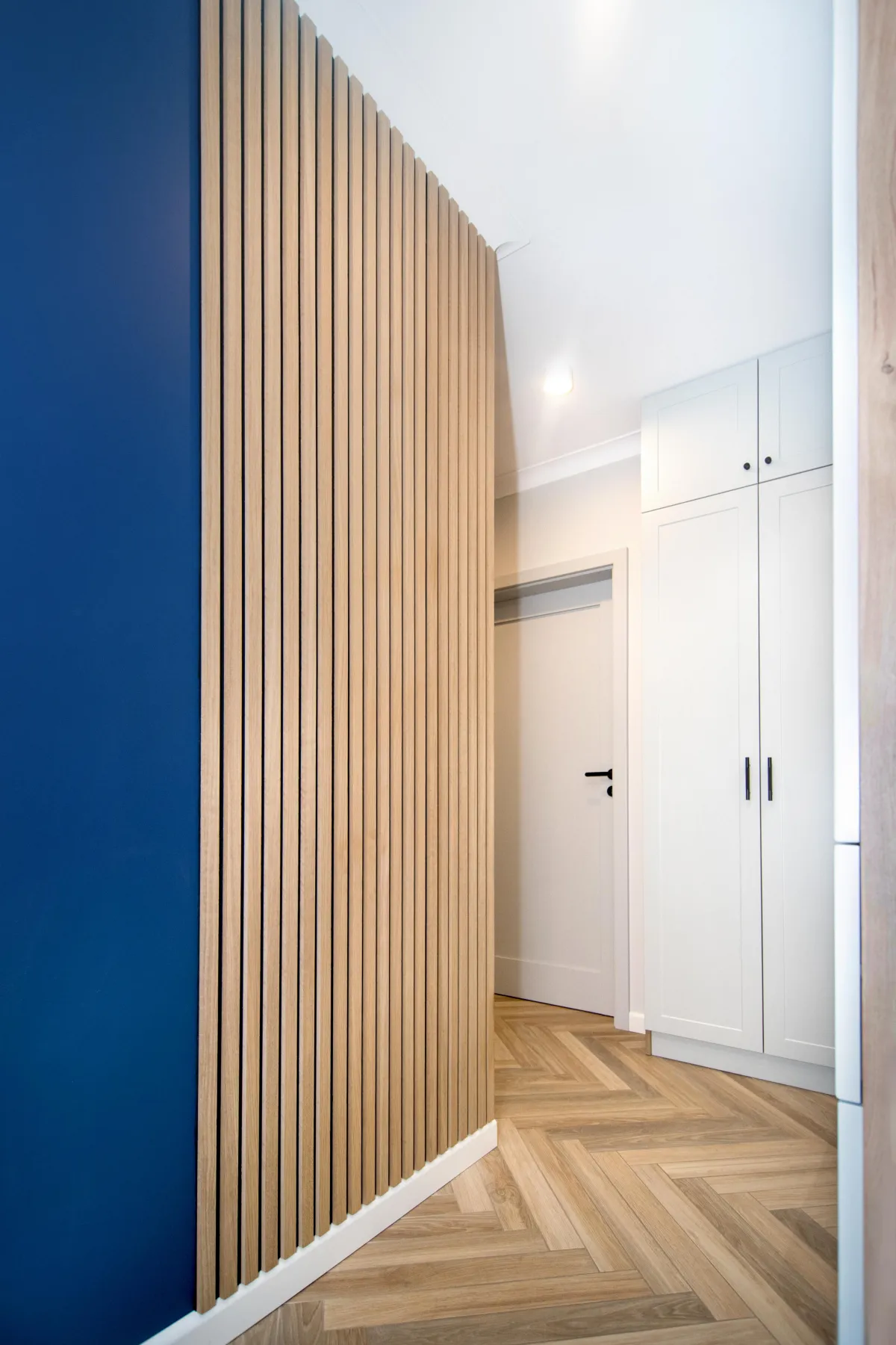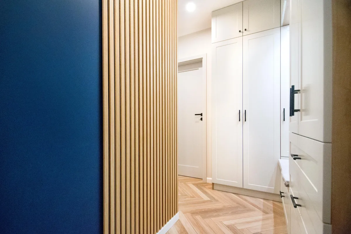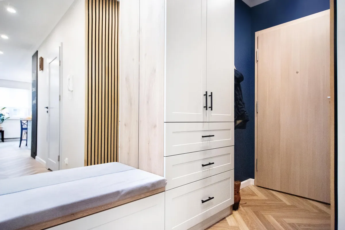 Meble wykonane przez stolarza na wymiar umożliwiły maksymalne wykorzystanie każdego centymetra. Długi korytarz, który rozpoczyna się tuż przy narożnym wejściu, został w pełni zagospodarowany szafami i schowkami, a następnie płynnie przechodzi w salon z aneksem kuchennym. Dzięki temu udało się stworzyć funkcjonalne i przytulne wnętrze idealne na nowy etap życia.