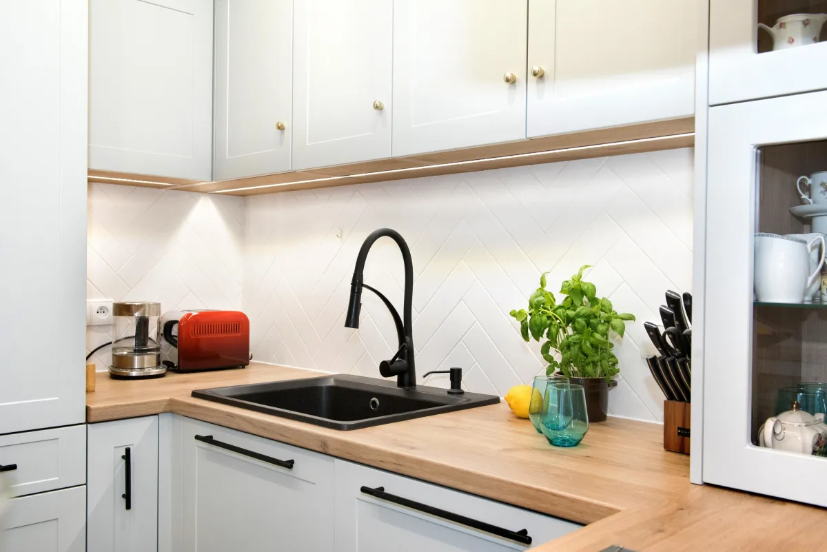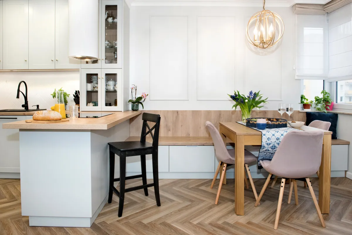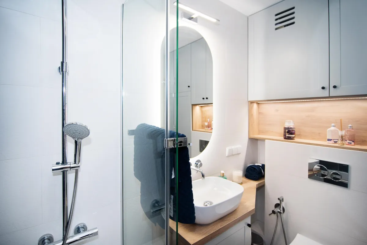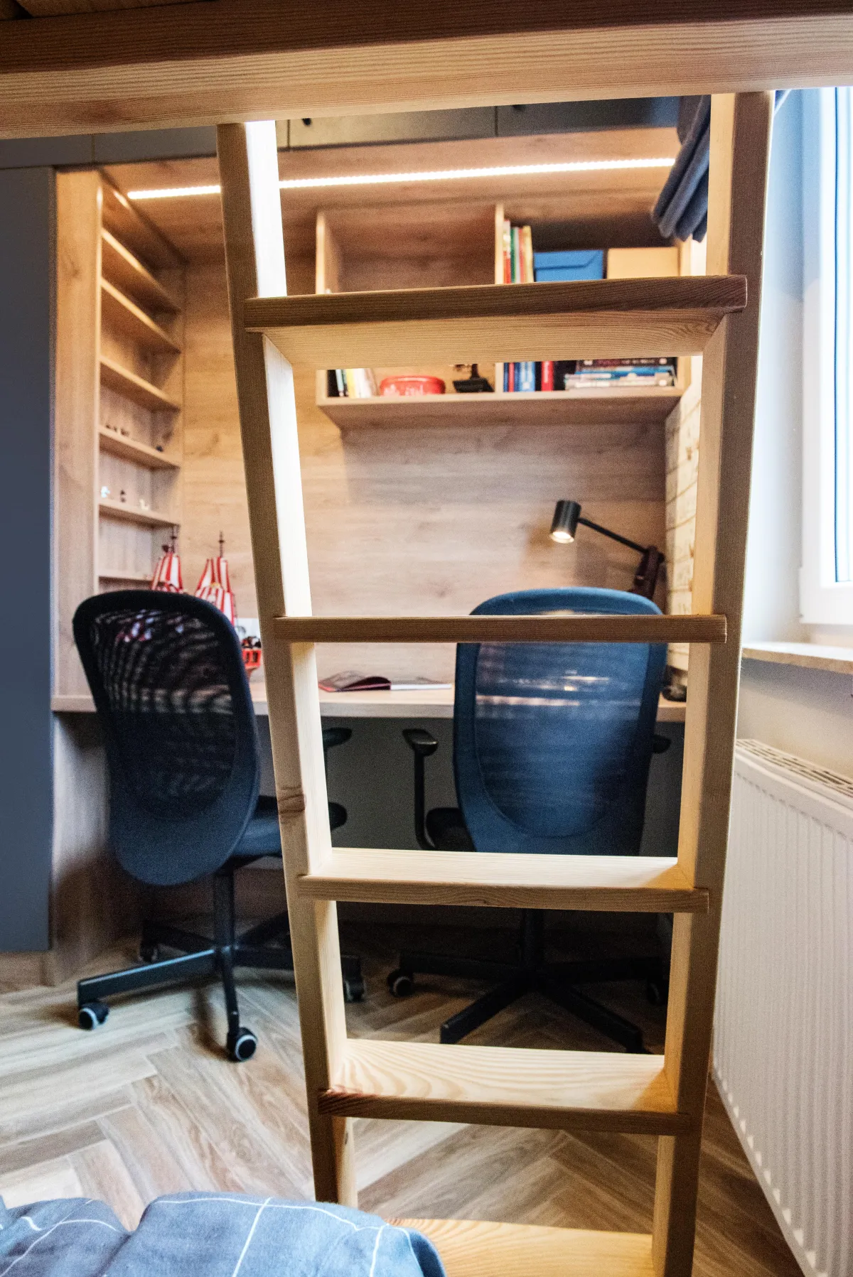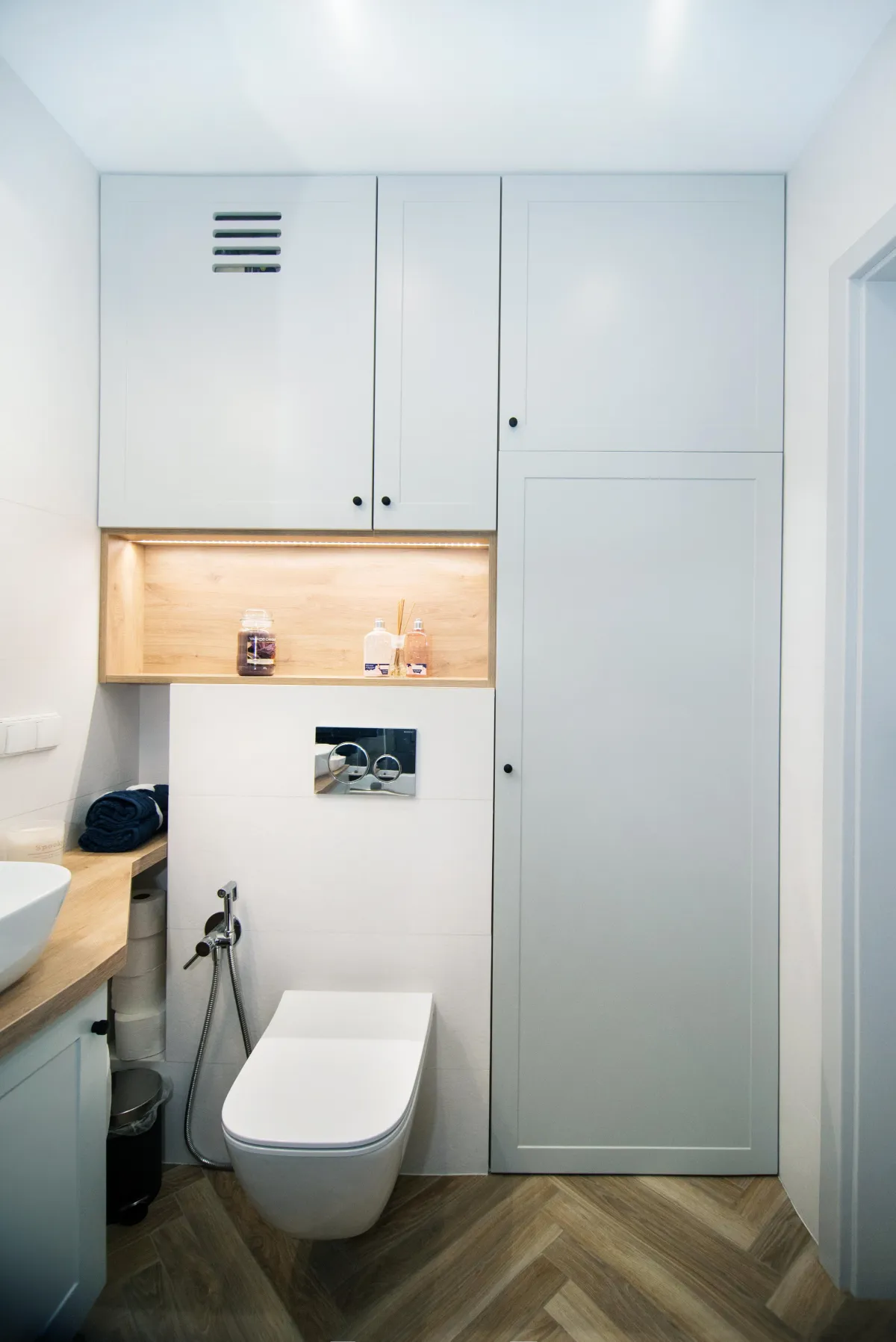 Meble wykonane przez stolarza na wymiar umożliwiły maksymalne wykorzystanie każdego centymetra. Długi korytarz, który rozpoczyna się tuż przy narożnym wejściu, został w pełni zagospodarowany szafami i schowkami, a następnie płynnie przechodzi w salon z aneksem kuchennym. Dzięki temu udało się stworzyć funkcjonalne i przytulne wnętrze idealne na nowy etap życia.