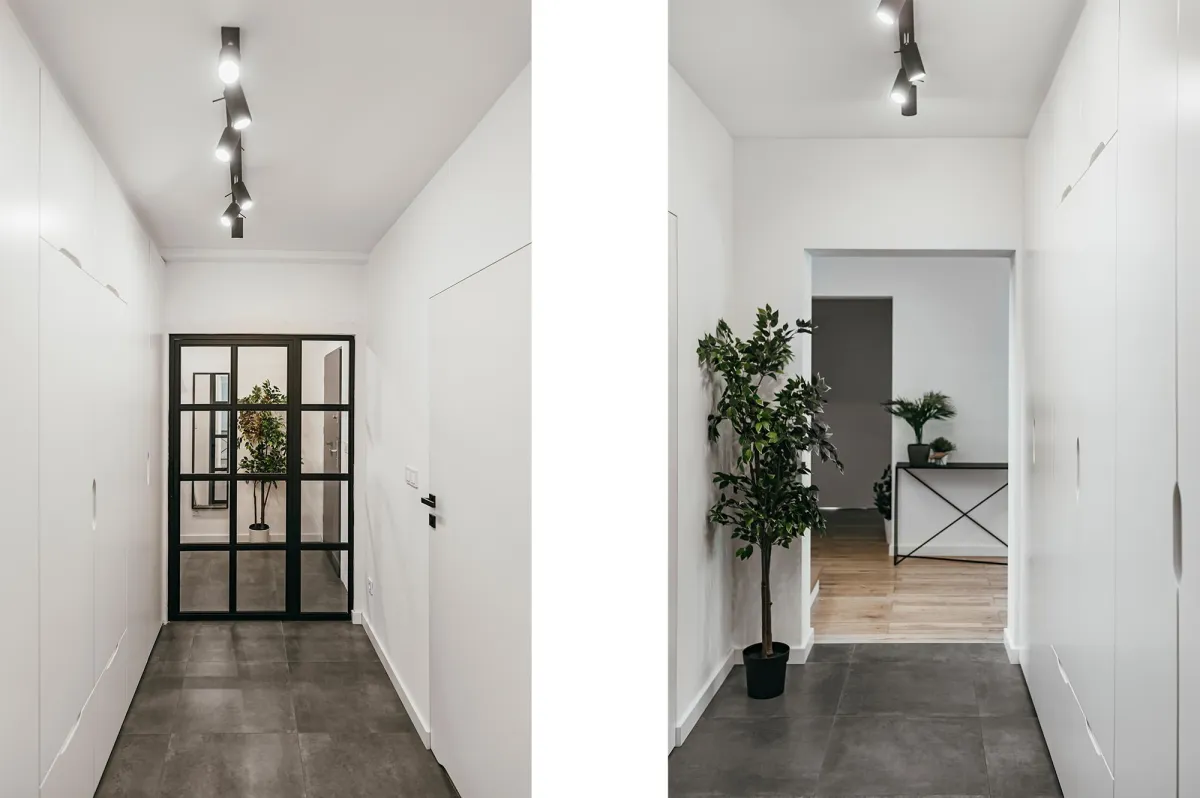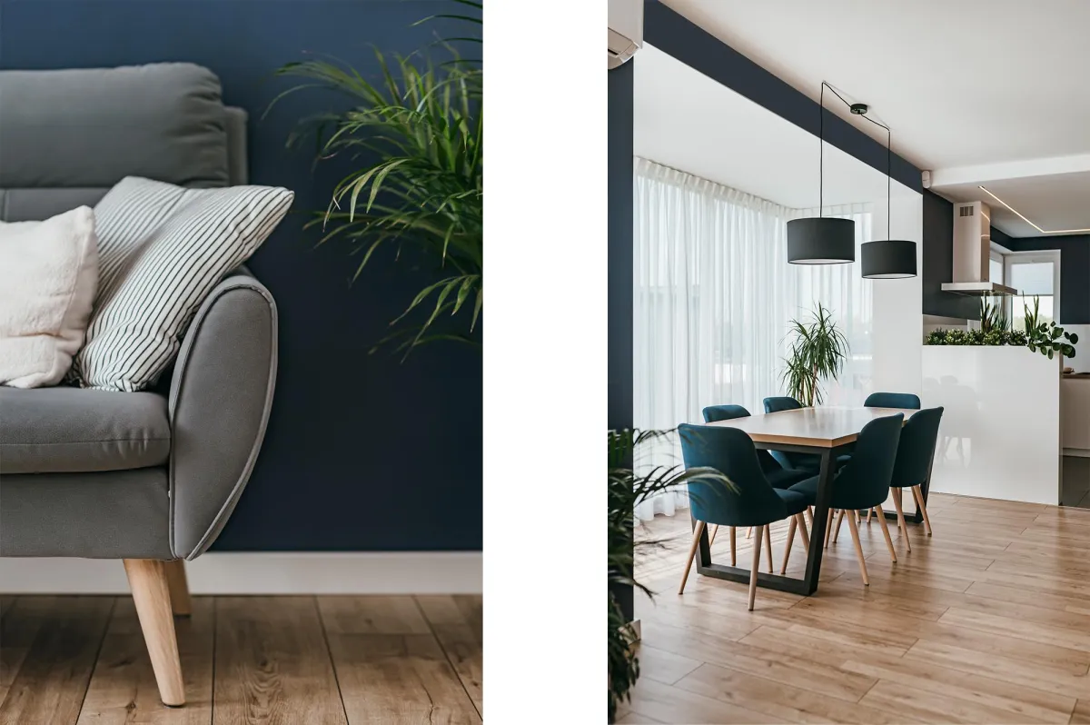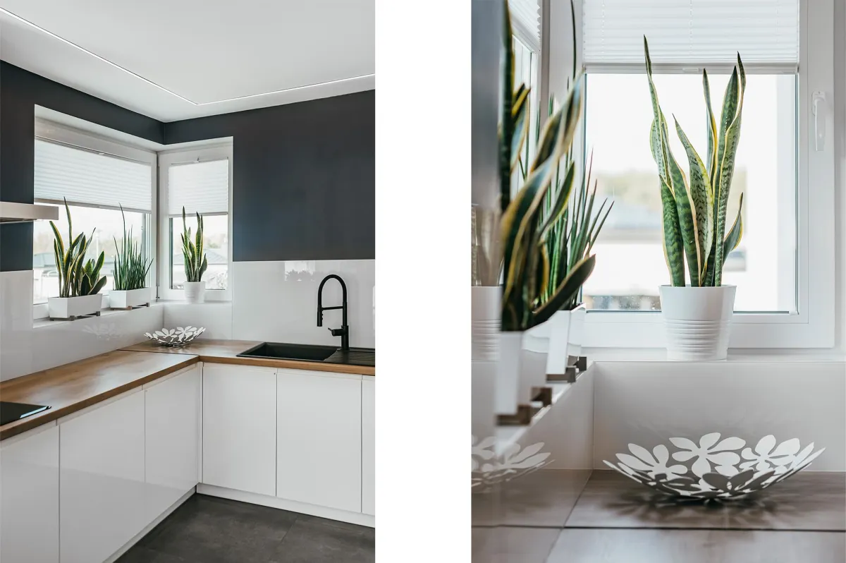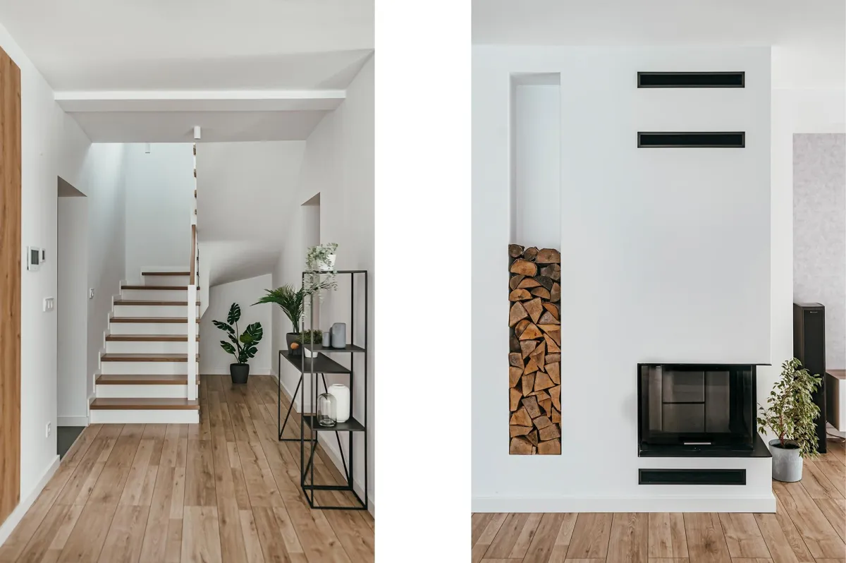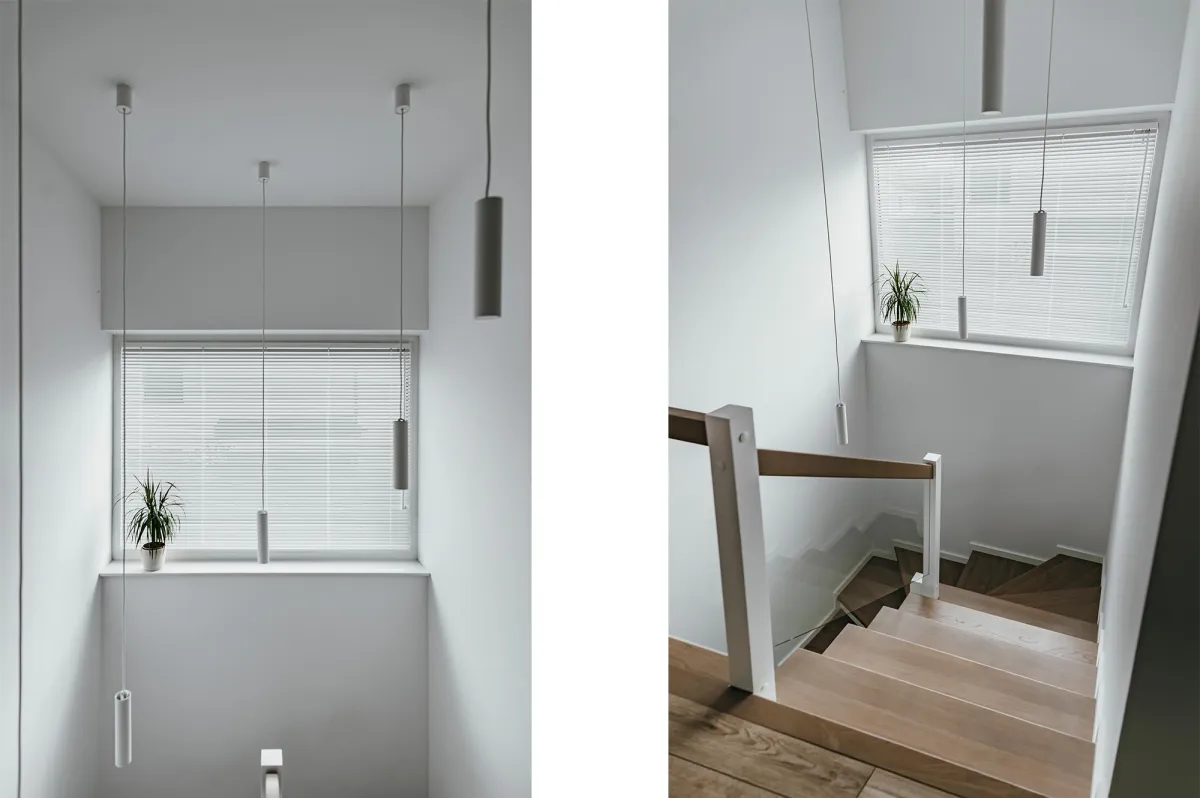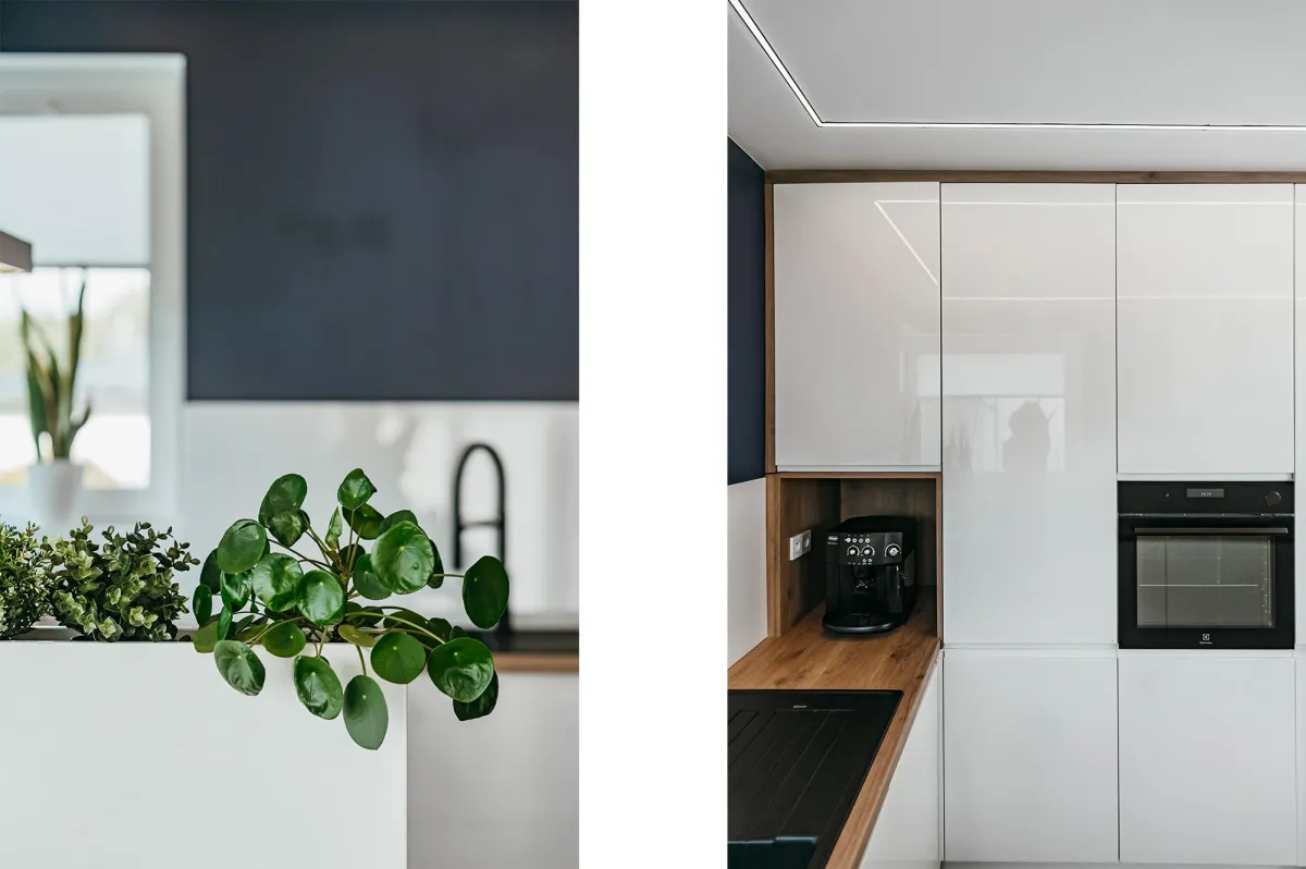 Projektowanie wnętrz w nowo powstającym domu dla powiększającej się rodziny jest zawsze przyjemnością; wnętrza te zostały zaprojektowane tak, by tworzyły wygodną i nowoczesną przestrzeń; na parterze znajduje się strefa dzienna, połączona długą granatową ścianą z kuchnią i jadalnią; na piętrze zlokalizowano kilka sypialni, w których dominuje światło i zieleń; obie łazienki zaprojektowano wykorzystując nowoczesne płytki i wyposażenie; przestrzenie łączące są natomiast jak białe tło z interesującymi akcentami w postaci głowy lwa na betonowej ścianie, czy czarnych smukłych konsoli z roślinami albo przeszklonych metalowych drzwi między wejściem a holem; jest tu dużo przestrzeni do przechowywania oraz dodatkowa sypialnia dla gości; wnętrza są wypełnione światłem i zielenią oraz wykończone dobrymi materiałami, są nowoczesne, ale i przytulne; tworzą z tego budynku prawdziwy rodzinny dom