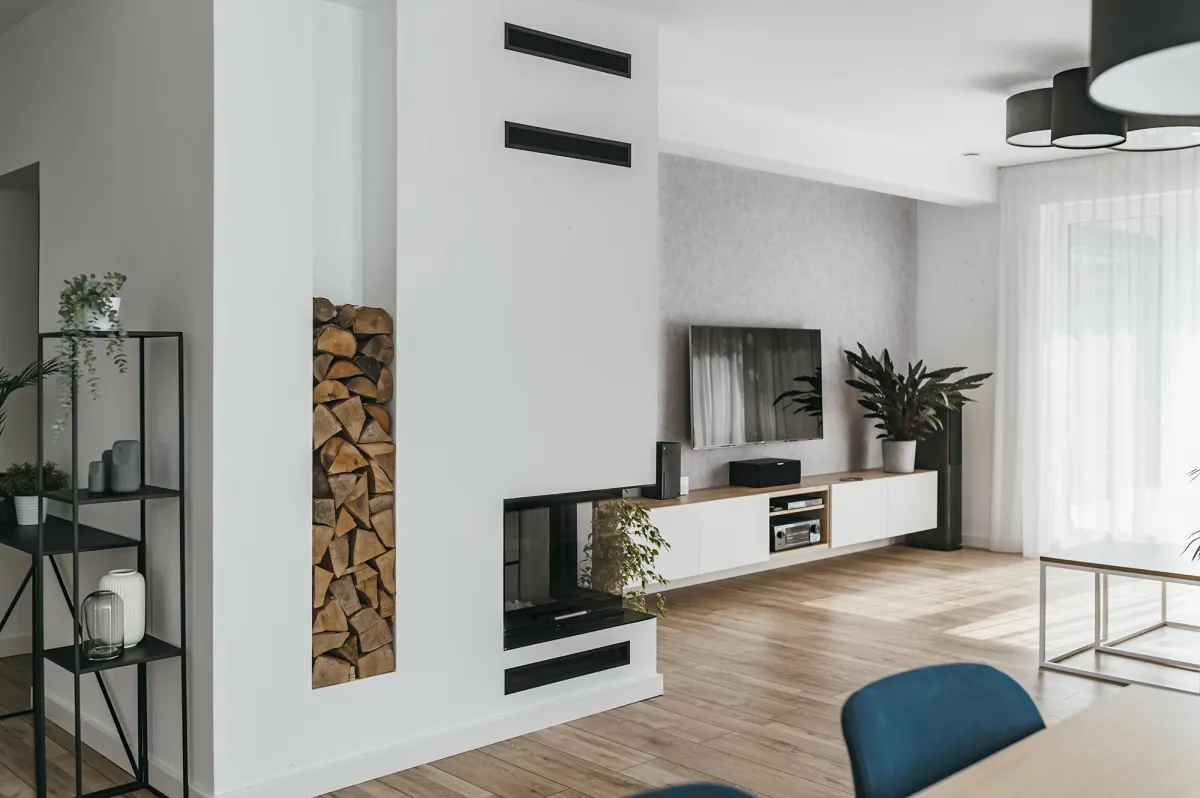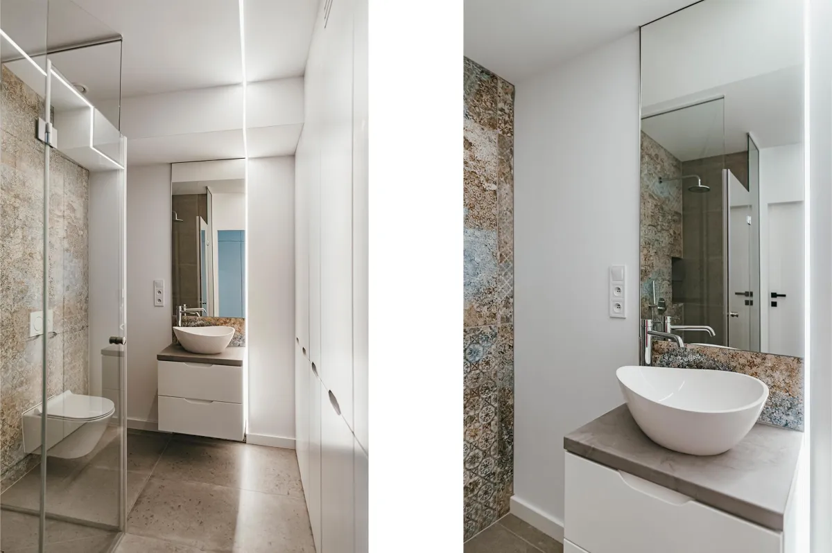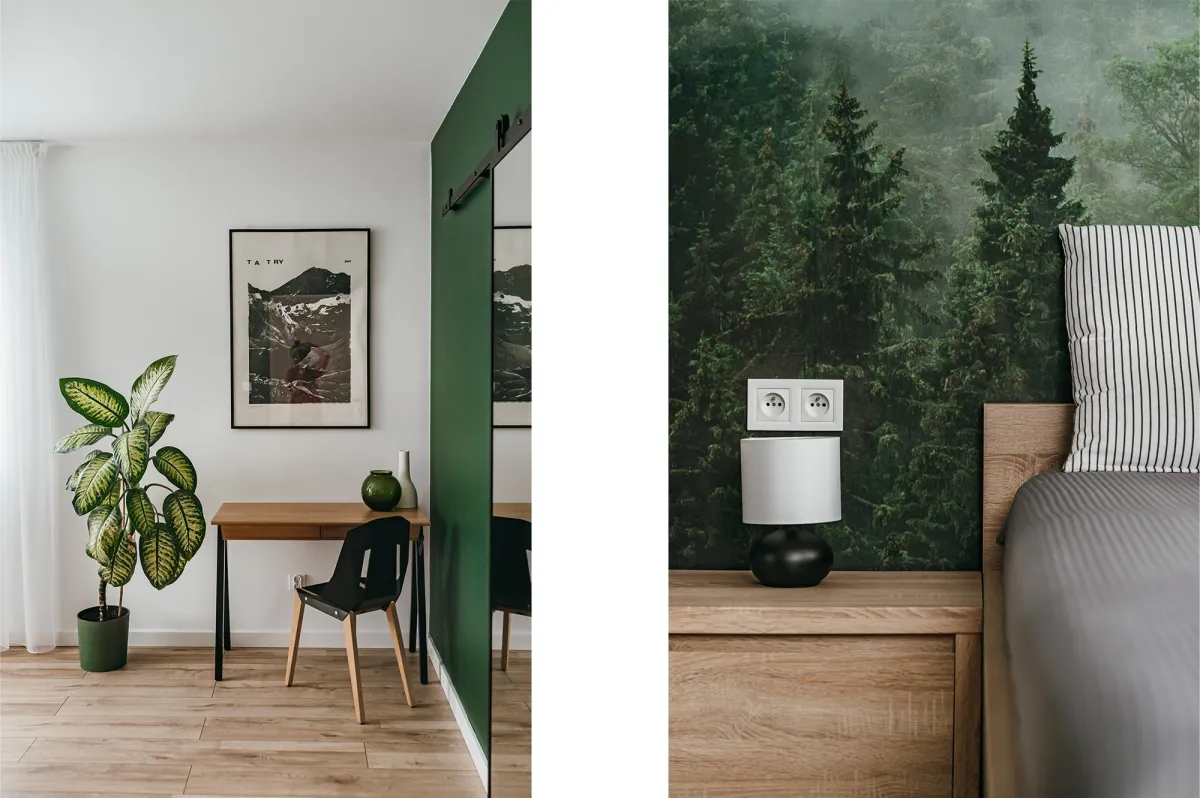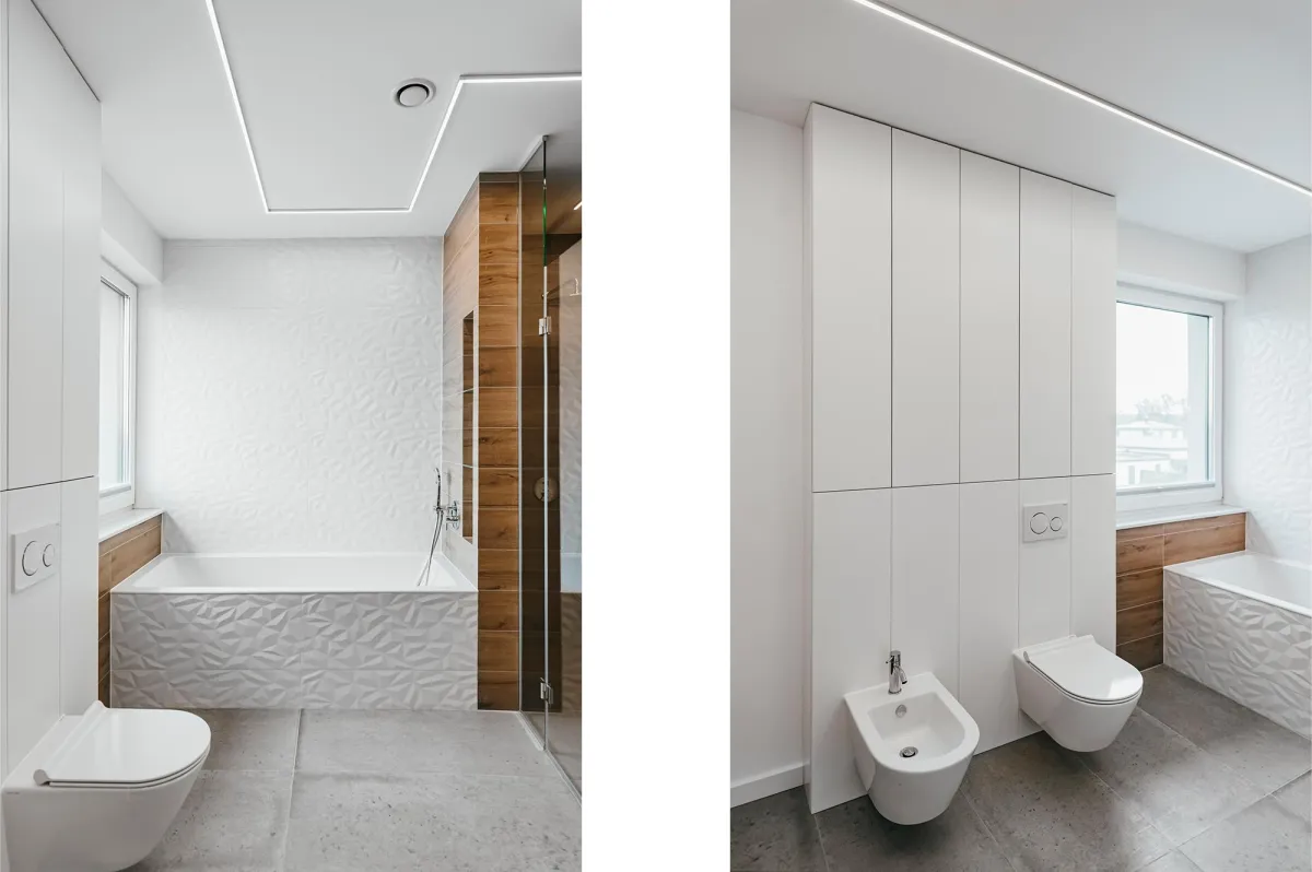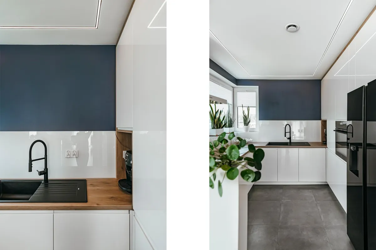 Projektowanie wnętrz w nowo powstającym domu dla powiększającej się rodziny jest zawsze przyjemnością; wnętrza te zostały zaprojektowane tak, by tworzyły wygodną i nowoczesną przestrzeń; na parterze znajduje się strefa dzienna, połączona długą granatową ścianą z kuchnią i jadalnią; na piętrze zlokalizowano kilka sypialni, w których dominuje światło i zieleń; obie łazienki zaprojektowano wykorzystując nowoczesne płytki i wyposażenie; przestrzenie łączące są natomiast jak białe tło z interesującymi akcentami w postaci głowy lwa na betonowej ścianie, czy czarnych smukłych konsoli z roślinami albo przeszklonych metalowych drzwi między wejściem a holem; jest tu dużo przestrzeni do przechowywania oraz dodatkowa sypialnia dla gości; wnętrza są wypełnione światłem i zielenią oraz wykończone dobrymi materiałami, są nowoczesne, ale i przytulne; tworzą z tego budynku prawdziwy rodzinny dom